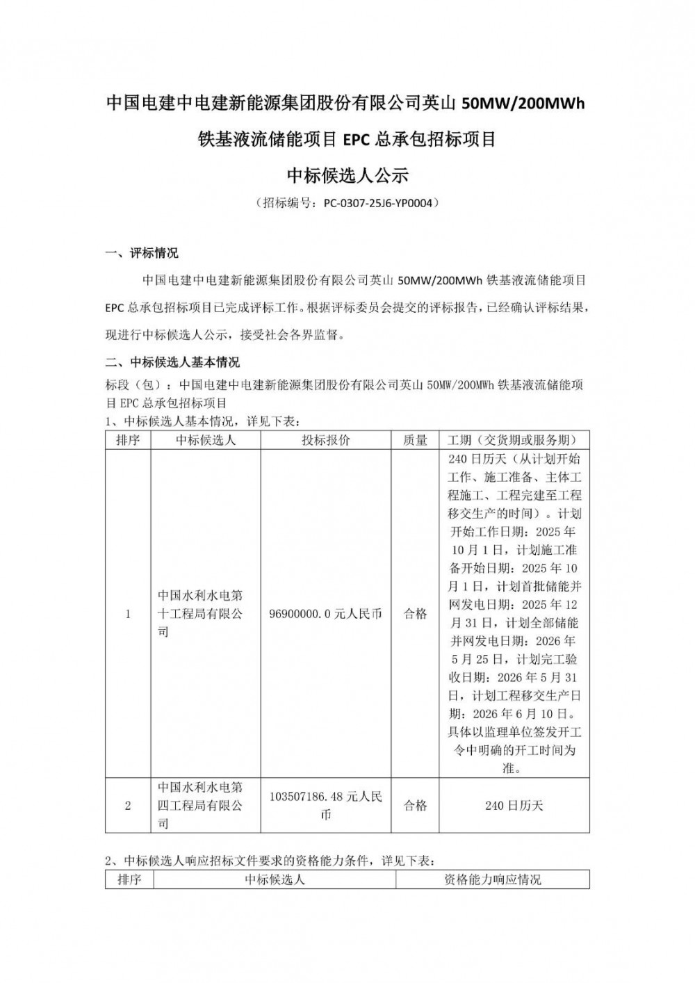 9月24日,中国电建中电建新能源集团股份有限公司英山50MW/200MWh铁基液流储能项目EPC总承包招标项目中标候选人公示。