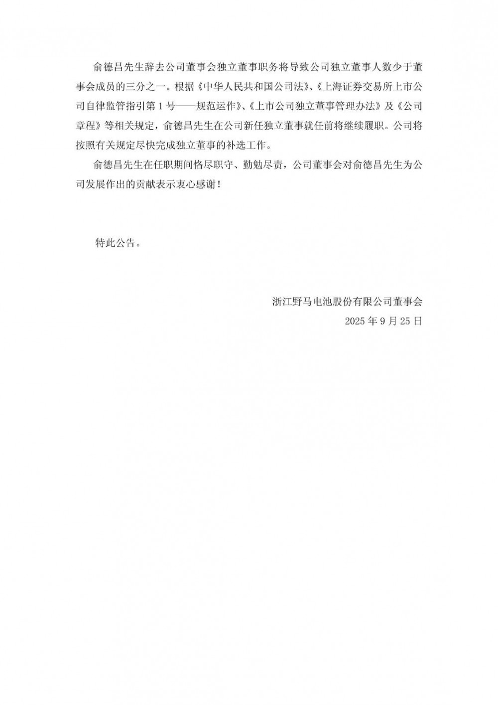 近日,野马电池发布公告称,公司董事会近日收到独立董事俞德昌先生的书面辞职报告。俞德昌先生因个人原因申请辞去独立董事、董事会审计委员会主任委员、董事会薪酬与考核委员会委员职务。俞德昌先生确认与公司董事会不存在争议。辞去以上职务后,俞德昌先生不再担任公司及控股子公司任何职务。