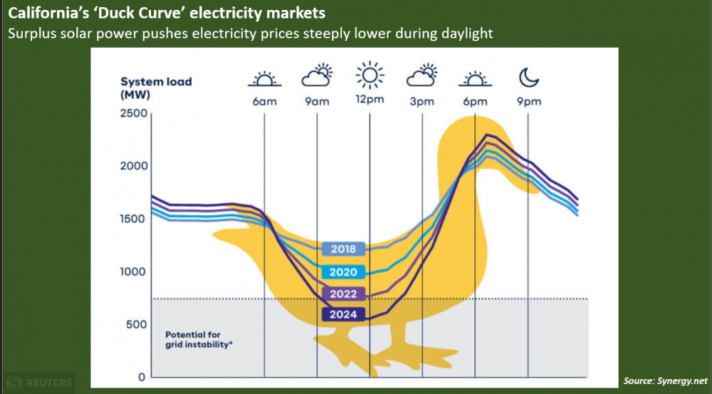 通过将部分剩余电力转移到电池而不是电网,加州独立系统运营商 (CAISO) 管理人员可以缓解所谓的“鸭子曲线”效应,即价格在太阳能输出达到峰值时往往会急剧下降,然后在晚上上升。