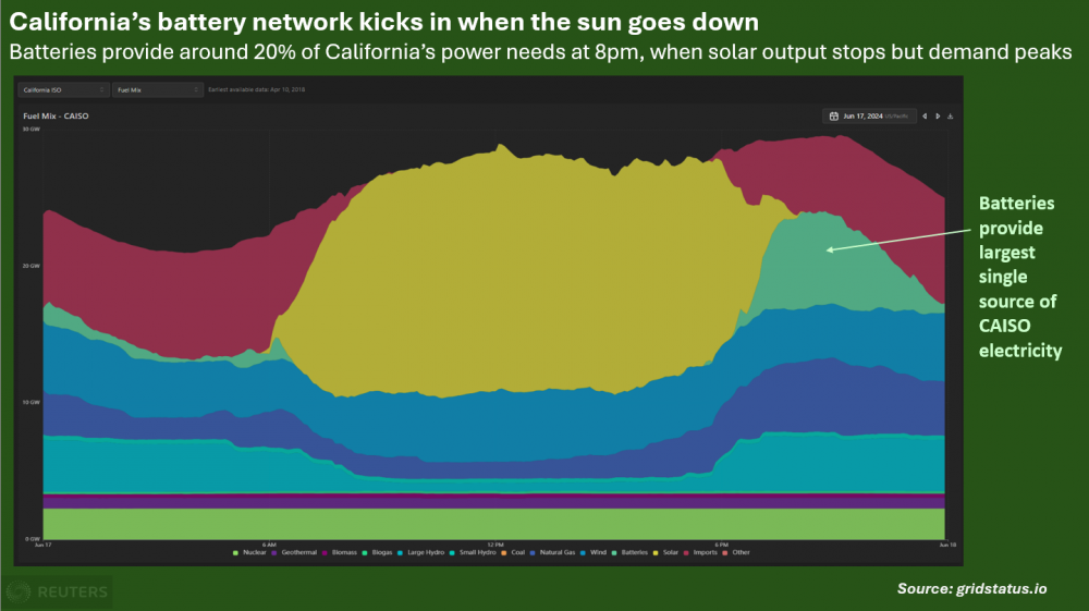 gridstatus.io 的数据显示,加州独立系统运营商 (CAISO)(该州的电力系统)的电力生产商已经使用电池储能在高峰用电期间供应高达系统 20% 的电力。