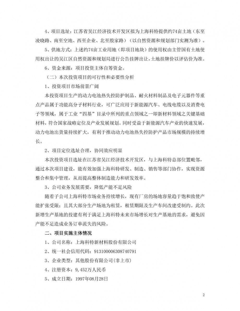 上海科特在江苏省吴江经济技术开发区内投资建设科特(苏州)新材料项目,建成动力电池热失控防护制品、耐火材料制品及电子元器件等高性能产品的研发、生产与销售基地。