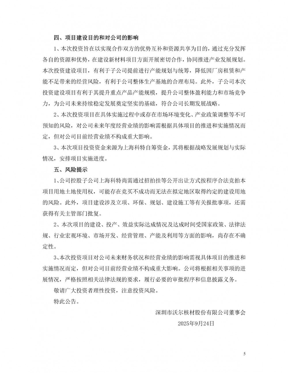 沃尔核材表示,本次投资旨在以实现合作双方的优势互补和资源共享为目的,通过充分发挥各自的资源和优势,在建设新材料项目方面开展密切合作,协同推进产业发展规划。本次投资建设项目,有利于子公司提前进行产能规划与统筹,降低因厂房租赁和产能不足带来的经营风险,有利于公司整体生产基地的合理布局。此外,子公司本次投资建设项目有利于其提升重点产品产能规模,提升公司整体盈利能力和市场竞争力,为公司未来持续稳定发展奠定坚实的基础,符合公司长期发展战略。