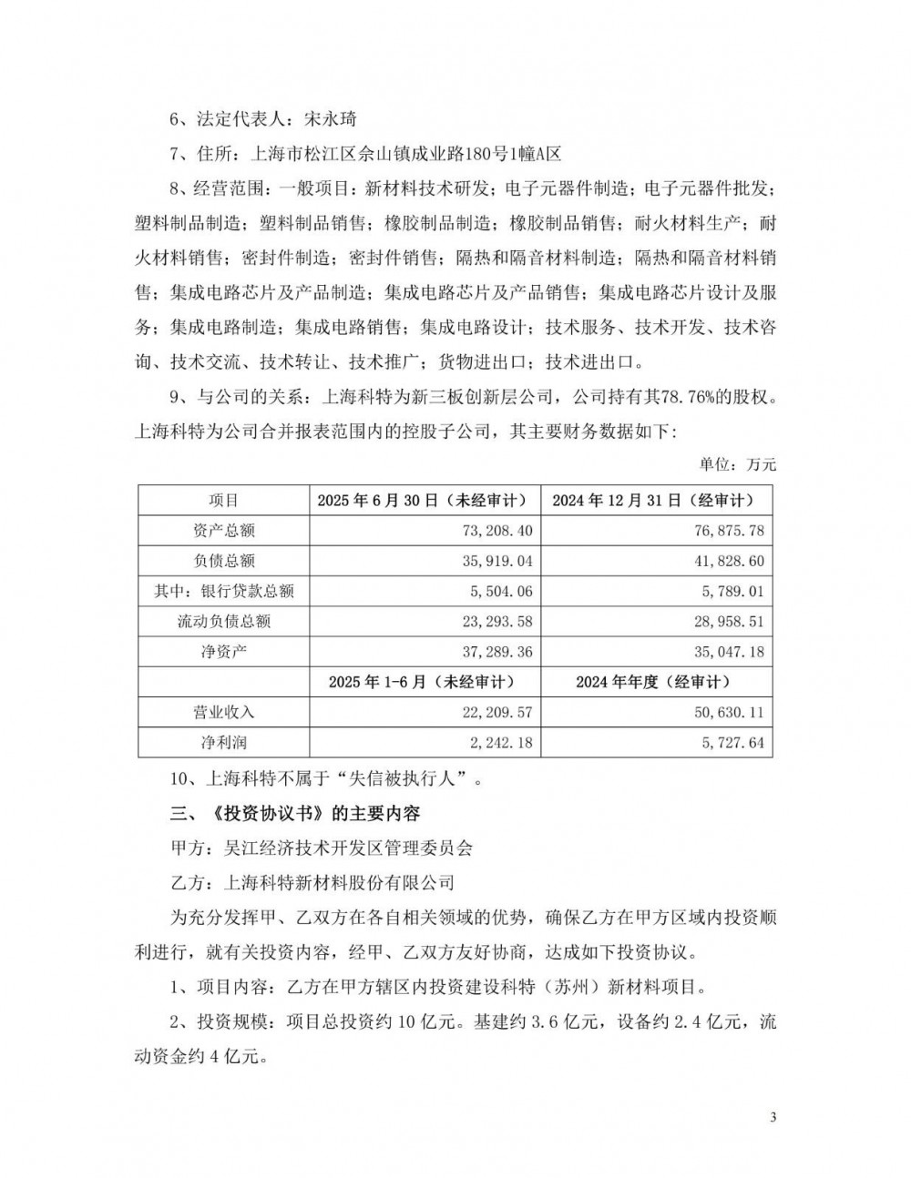 近日,沃尔核材发布公告称,公司召开第七届董事会第三十二次会议,审议通过了《关于控股子公司对外投资建设项目暨签订<投资协议书>的议案》,同意公司控股子公司上海科特新材料股份有限公司(以下简称“上海科特”)使用不超过人民币100,000万元在江苏省吴江经济技术开发区投资建设科特(苏州)新材料项目。同日,上海科特与吴江经济技术开发区管理委员会签订了《投资协议书》。