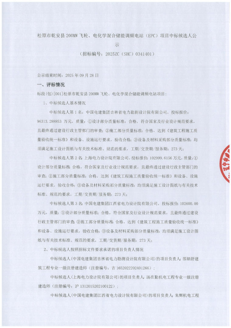9月25日,吉林省松原市乾安县200MW飞轮、电化学混合储能调频电站(EPC)项目中标候选人公示。