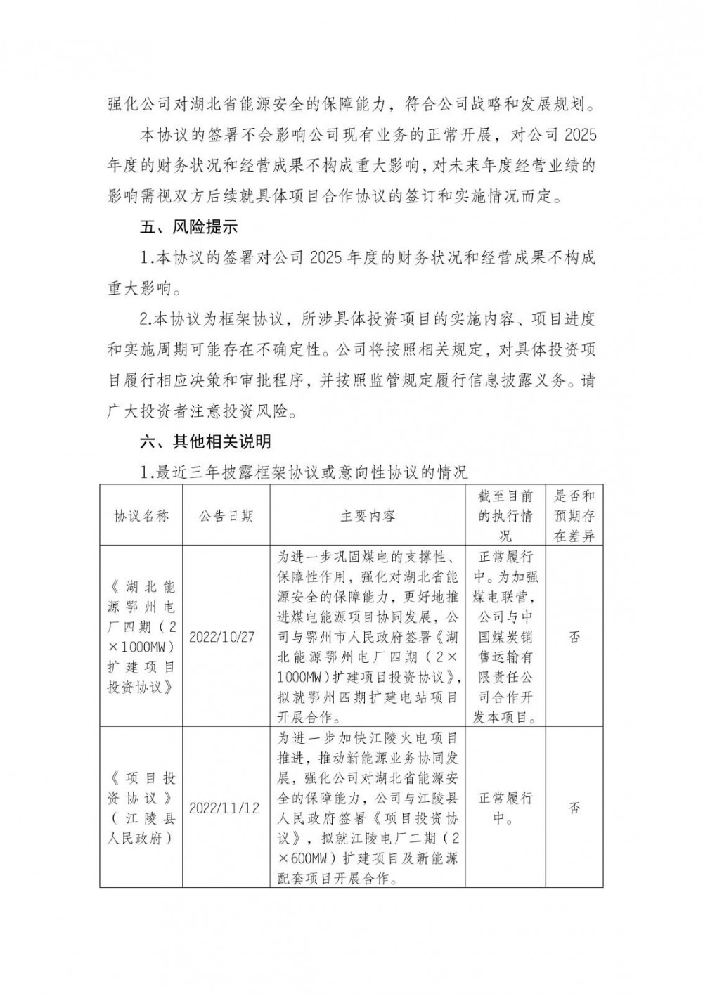 湖北能源表示,公司与襄阳市政府签订本协议,通过建立长效合作机制,充分利用各自优势,共同推进风光火储及综合能源项目发展,有利于进一步强化公司对湖北省能源安全的保障能力,符合公司战略和发展规划。本协议的签署不会影响公司现有业务的正常开展,对公司2025年度的财务状况和经营成果不构成重大影响,对未来年度经营业绩的影响需视双方后续就具体项目合作协议的签订和实施情况而定。