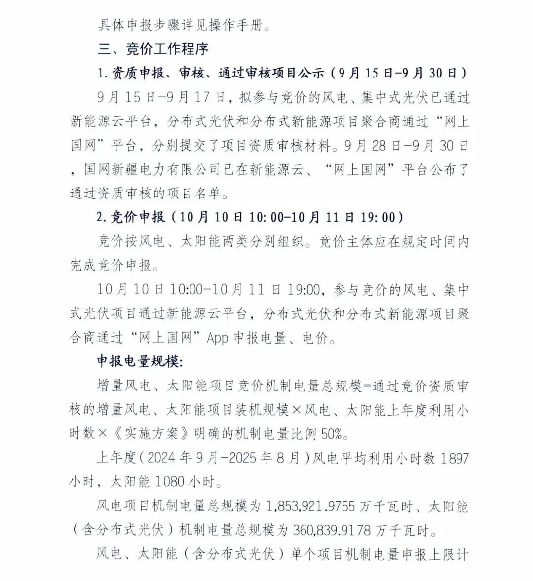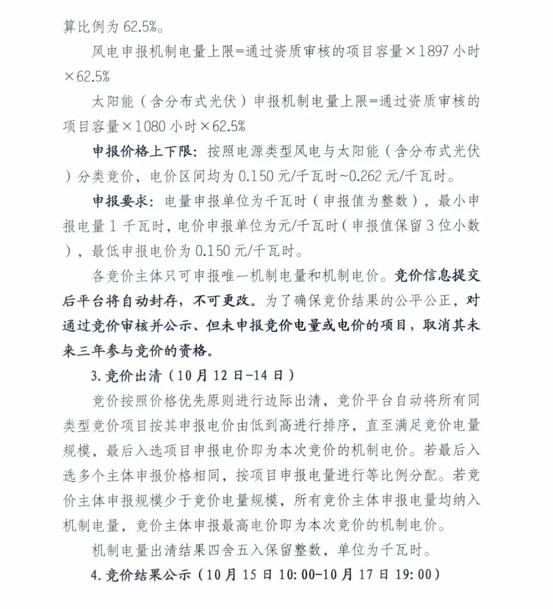 10月10日10:00开始竞价申报,竞价按风电、太阳能两类分别组织。竞价主体应在规定时间内完成竞价申报。