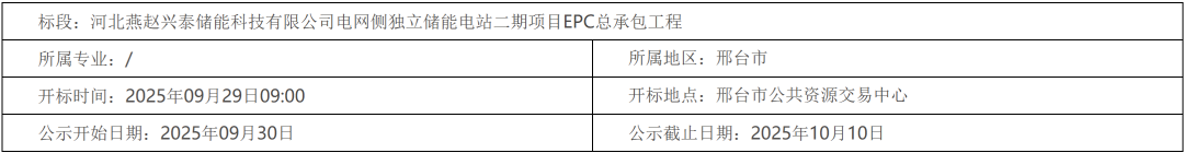 河北燕赵兴泰储能科技有限公司电网侧独立储能电站二期项目EPC总承包工程中标候选人公示