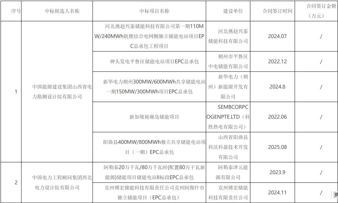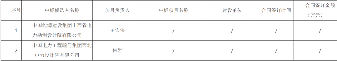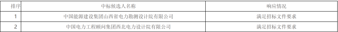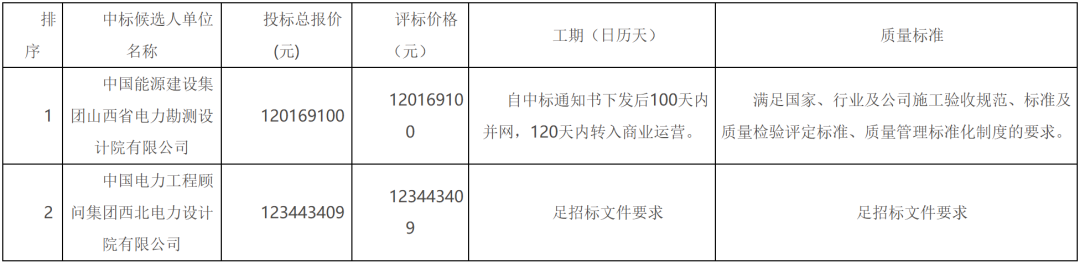 第一中标候选人为中国能源建设集团山西省电力勘测设计院有限公司,投标报价为120169100元,折合单价0.7069元/Wh;第二中标候选人为中国电力工程顾问集团西北电力设计院有限公司,投标报价为123443409元,折合单价0.7261元/Wh。