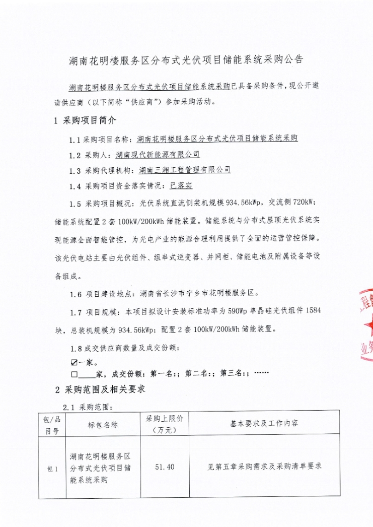 据储能界了解到,6月28日,湖南花明楼服务区分布式光伏项目储能系统采购公告发布。