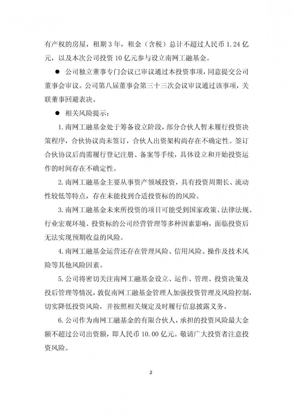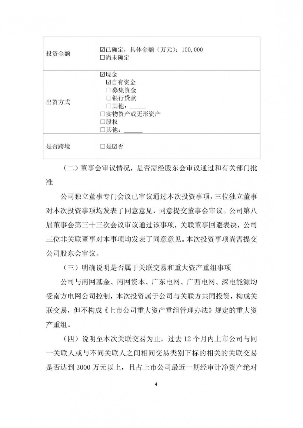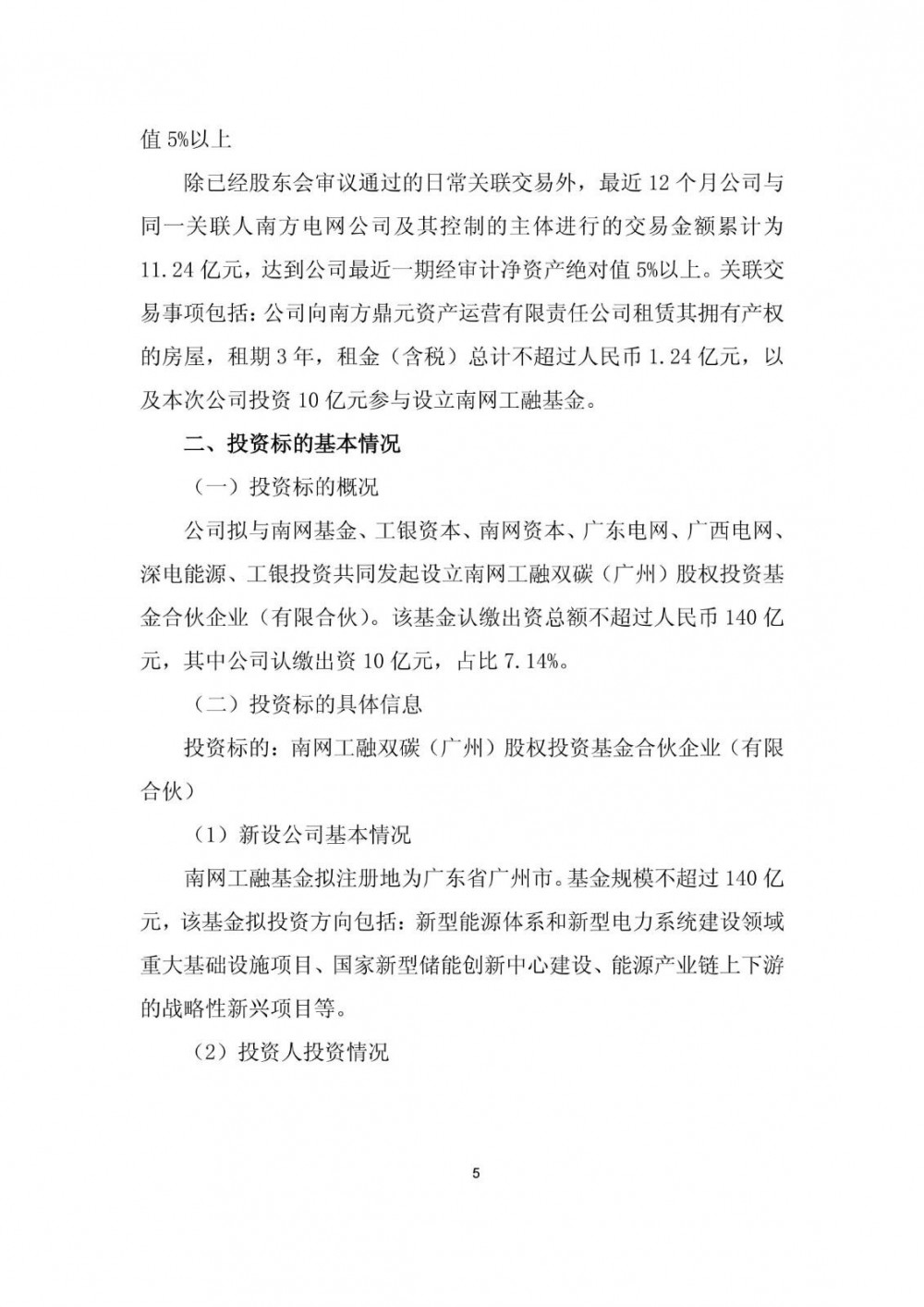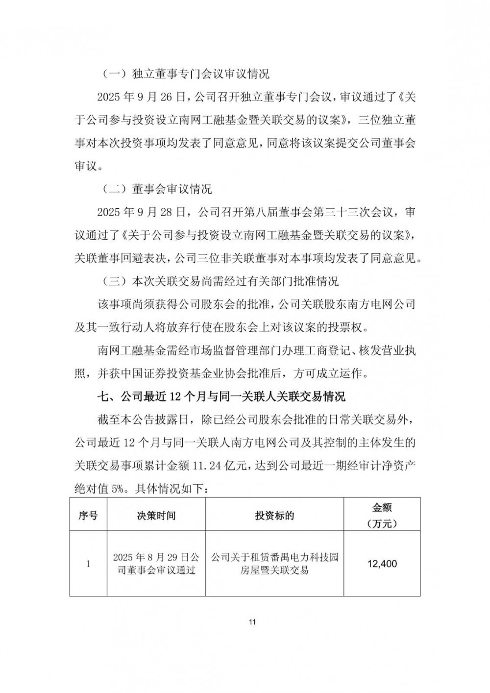公告显示,除已经股东会审议通过的日常关联交易外,最近12个月公司与同一关联人南方电网公司及其控制的主体进行的交易金额累计为11.24亿元,达到公司最近一期经审计净资产绝对值5%以上。关联交易事项包括:公司向南方鼎元资产运营有限责任公司租赁其拥有产权的房屋,租期3年,租金(含税)总计不超过人民币1.24亿元,以及本次公司投资10亿元参与设立南网工融基金。