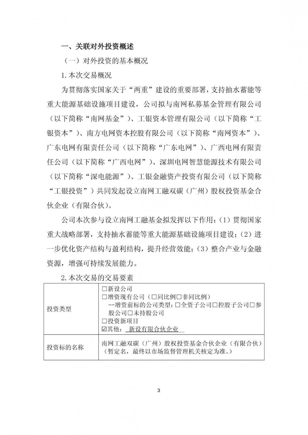 近日,南网储能发布公告称,为贯彻落实国家关于“两重”建设的重要部署,支持抽水蓄能等重大能源基础设施项目建设,公司拟与南网私募基金管理有限公司、工银资本管理有限公司、南方电网资本控股有限公司、广东电网有限责任公司、广西电网有限责任公司、深圳电网智慧能源技术有限公司、工银金融资产投资有限公司共同发起设立南网工融双碳(广州)股权投资基金合伙企业(有限合伙)。