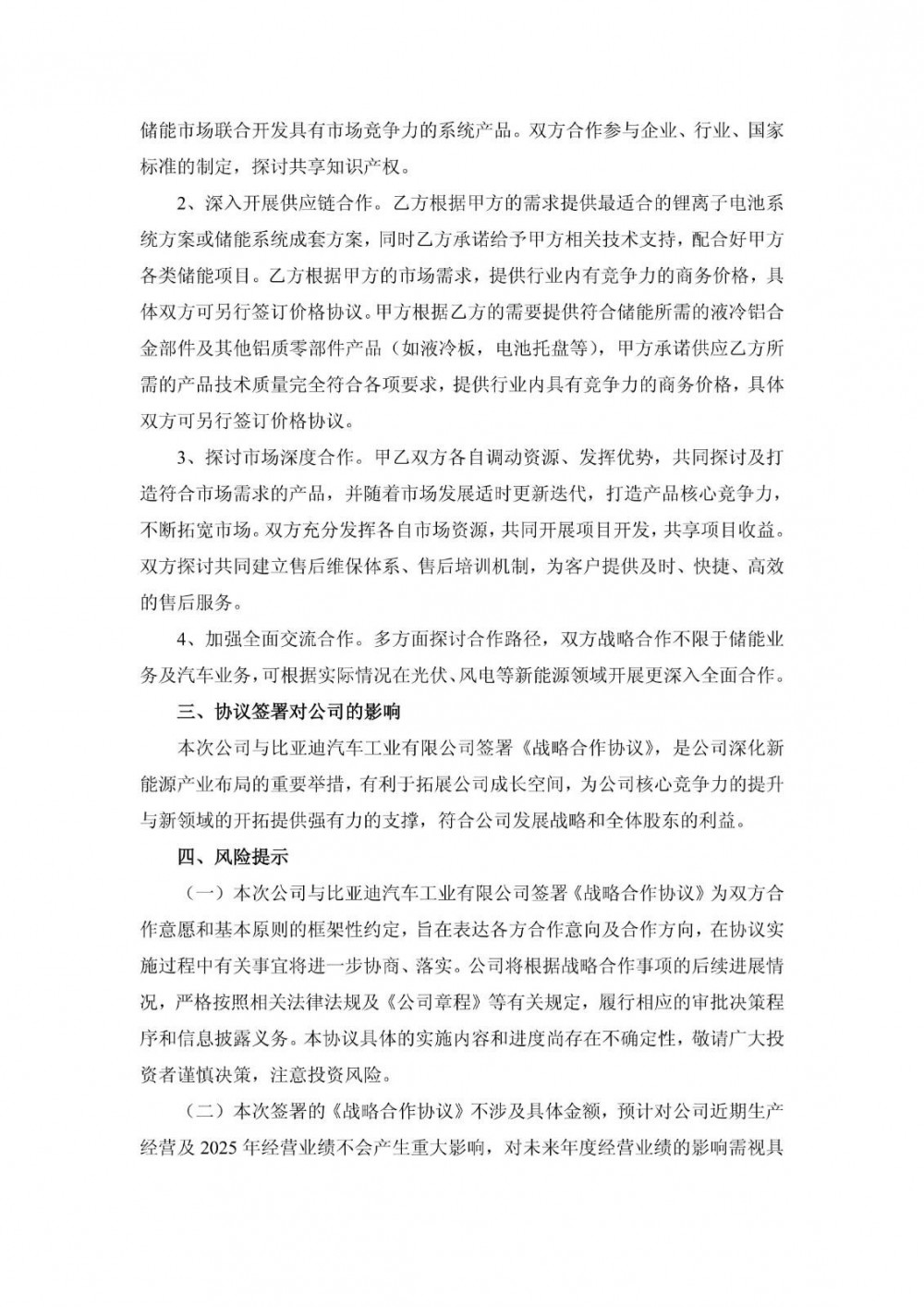 双方同意建立战略合作伙伴关系,并视对方为重要的长期合作伙伴之一,在遵守国家法律及各自行业有关规定的前提下,相互支持、平等合作、整合资源、互惠共赢,利用双方各自在技术、供应保障及市场方面已有的优势,开展储能等项目,以及比亚迪所需的储能铝合金部件及其他铝质零部件等项目领域的战略合作,以获取市场成功,达到双赢目标,并面向战略性新领域共同探索潜在合作机会。