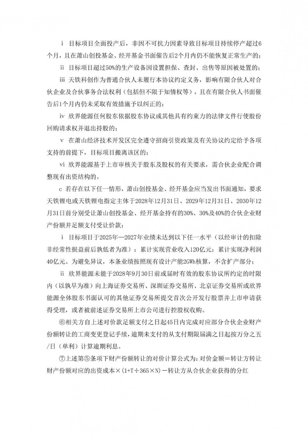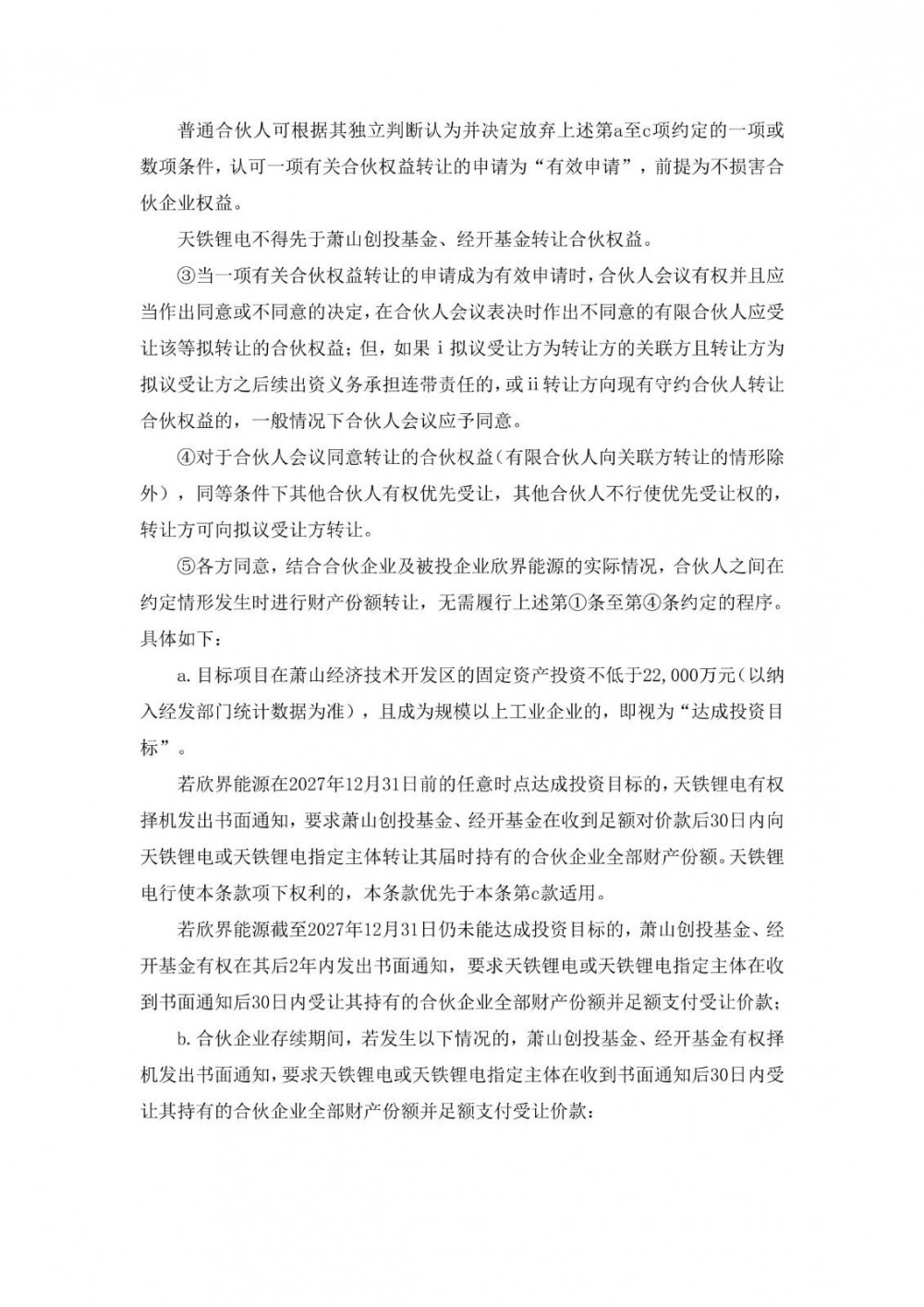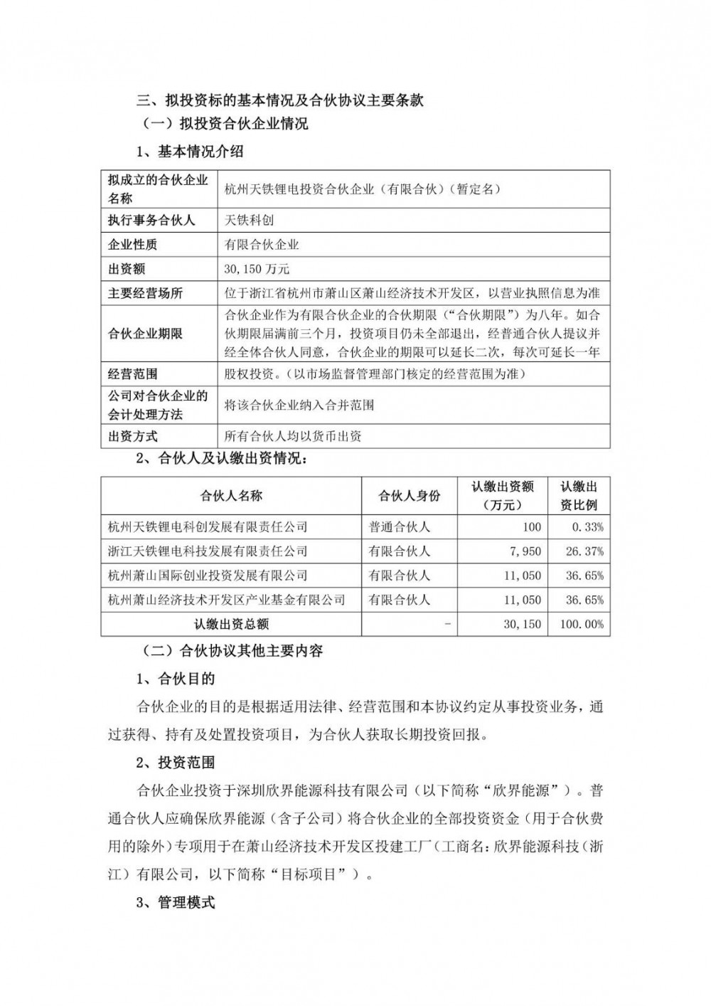 10月9日,天铁科技发布公告称,公司全资子公司杭州天铁锂电科创发展有限责任公司、浙江天铁锂电科技发展有限责任公司与专业投资机构杭州萧山国际创业投资发展有限公司、杭州萧山经济技术开发区产业基金有限公司于2025年9月30日签署了《杭州天铁锂电投资合伙企业(有限合伙)(暂定名)合伙协议》,拟共同出资设立杭州天铁锂电投资合伙企业(有限合伙),全体合伙人认缴出资总额为30,150万元(人民币,下同),其中天铁科创作为普通合伙人和执行事务合伙人认缴出资100万元,占比0.33%,天铁锂电作为有限合伙人认缴出资7,950万元,占比26.37%,萧山创投基金和经开基金均作为有限合伙人各认缴出资11,050万元,占比均为36.65%。