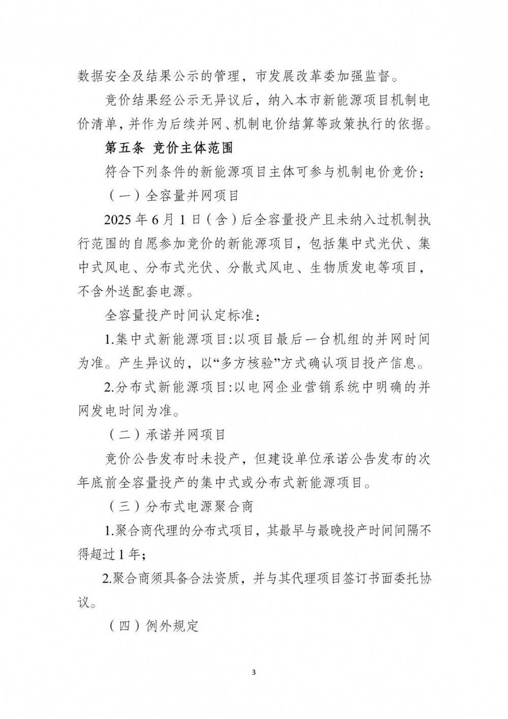(一)全容量并网项目。2025年6月1日(含)后全容量投产且未纳入过机制执行范围的自愿参加竞价的新能源项目,包括集中式光伏、集:中式风电、分布式光伏、分散式风电、生物质发电等项目,不含外送配套电源。全容量投产时间认定标准:1.集中式新能源项目:以项目最后一台机组的并网时间为准。产生异议的,以“多方核验”方式确认项目投产信息。2.分布式新能源项目:以电网企业营销系统中明确的并网发电时间为准。