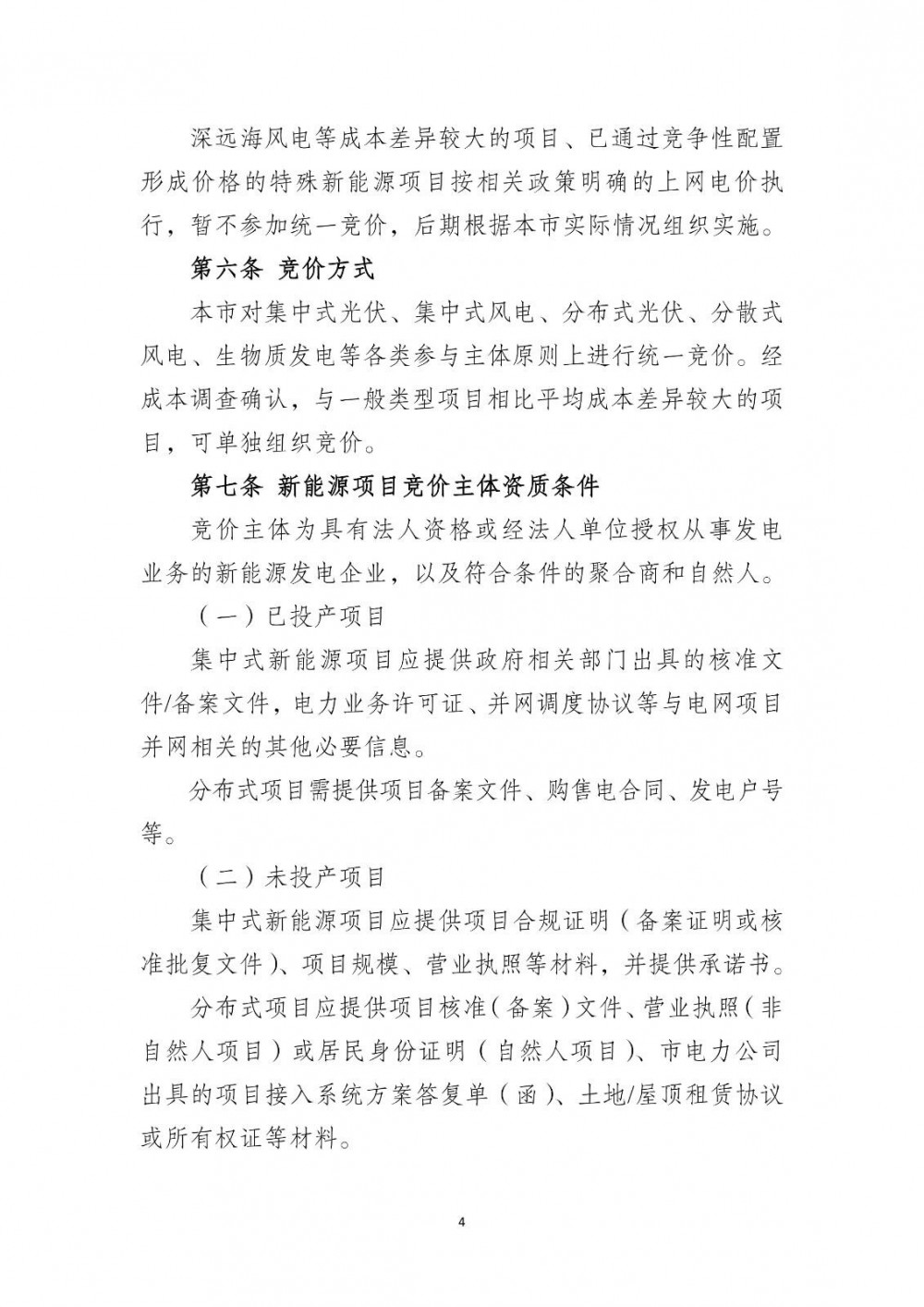 (四)例外规定。深远海风电等成本差异较大的项目、已通过竞争性配置形成价格的特殊新能源项目按相关政策明确的上网电价执行,暂不参加统一竞价,后期根据本市实际情况组织实施。