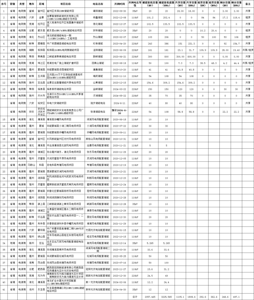 安徽省能源局关于2024年7月独立新型储能项目统筹调用的公示