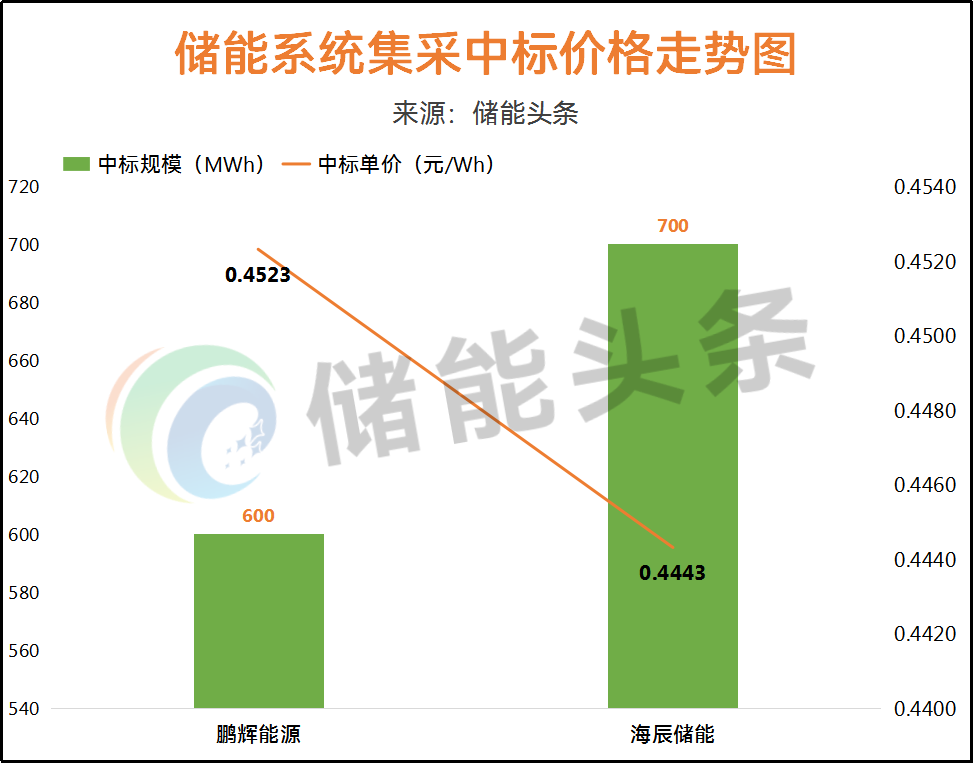 1个储能系统集采框采中标项目,2家企业给出报价,价格区间在0.4443元/Wh-0.4523元/Wh,均价0.4483元/Wh。