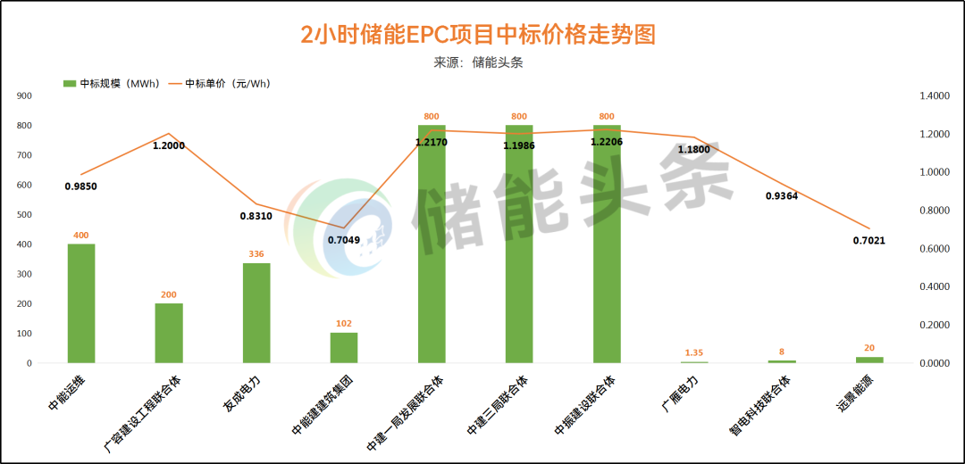 最低价为远景能源有限公司在中节能太阳能宁夏公司、石嘴山农业公司两个光伏电站配建储能电站项目EPC工程总承包中报出,单价0.7021元/Wh。