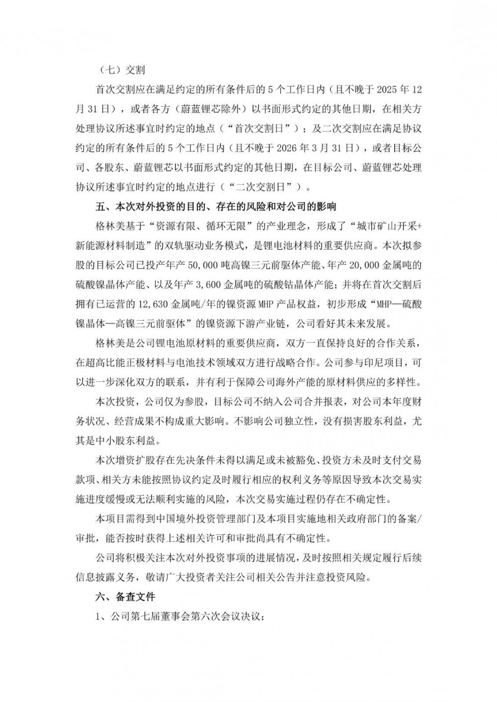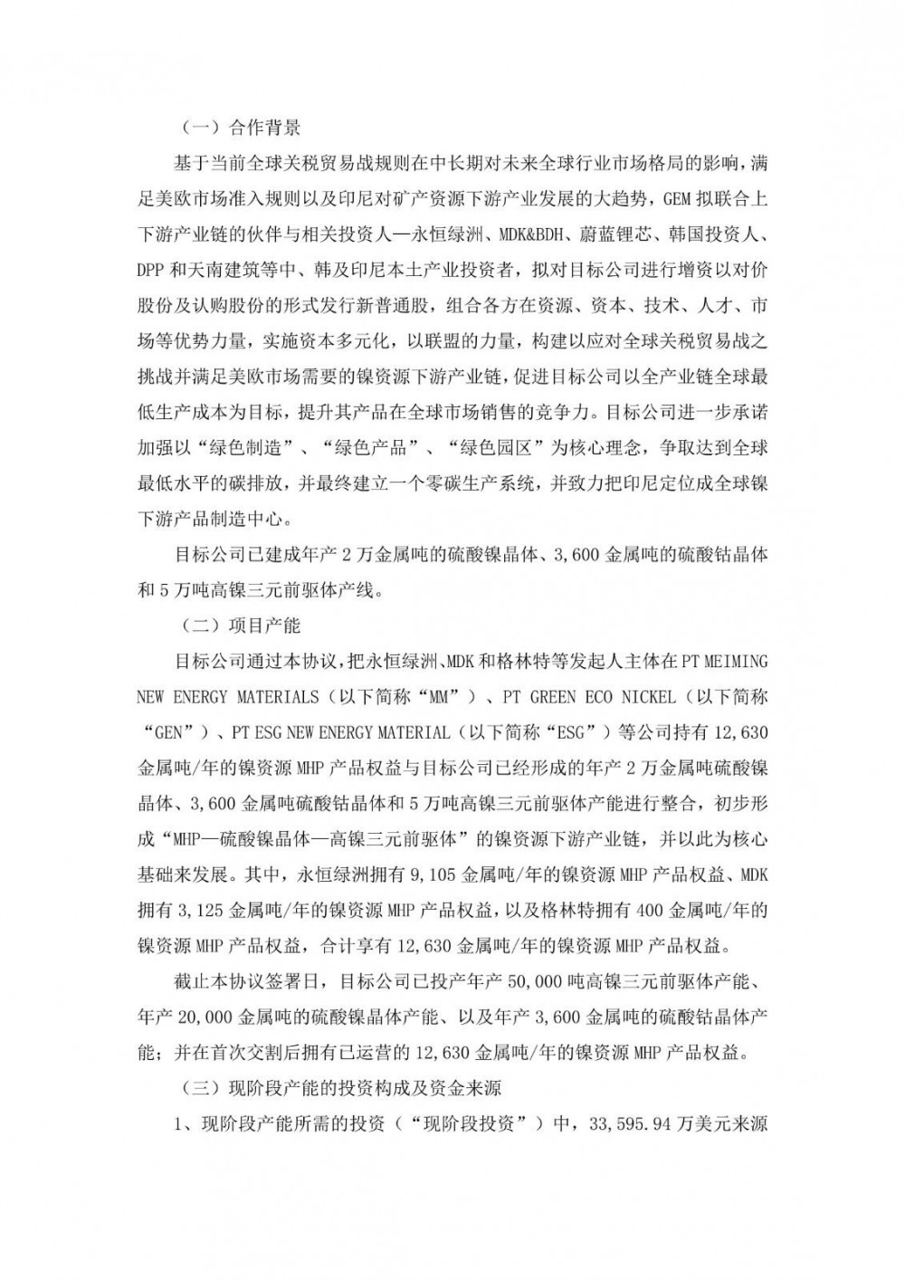 格林美基于“资源有限、循环无限”的产业理念,形成了“城市矿山开采+新能源材料制造”的双轨驱动业务模式,是锂电池材料的重要供应商。本次拟参股的目标公司已投产年产50,000吨高镍三元前驱体产能、年产20,000金属吨的硫酸镍晶体产能、以及年产3,600金属吨的硫酸钴晶体产能;并将在首次交割后拥有已运营的12,630金属吨/年的镍资源MHP产品权益,初步形成“MHP—硫酸镍晶体—高镍三元前驱体”的镍资源下游产业链,公司看好其未来发展。