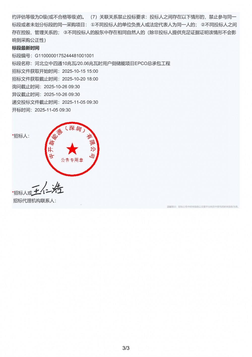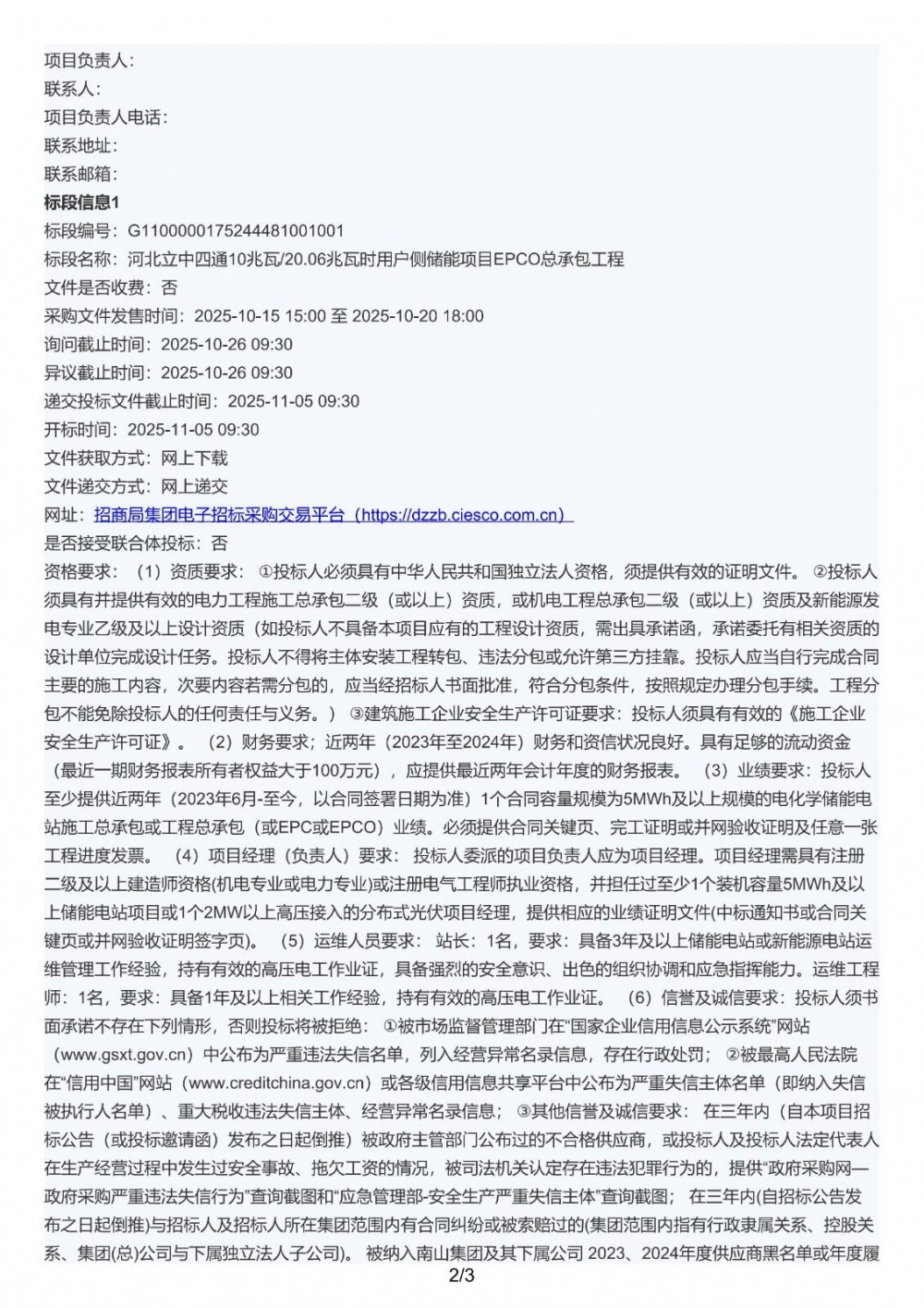 10月15日,河北立中四通10兆瓦/20.06兆瓦时用户侧储能项目EPCO总承包工程招标公告发布。