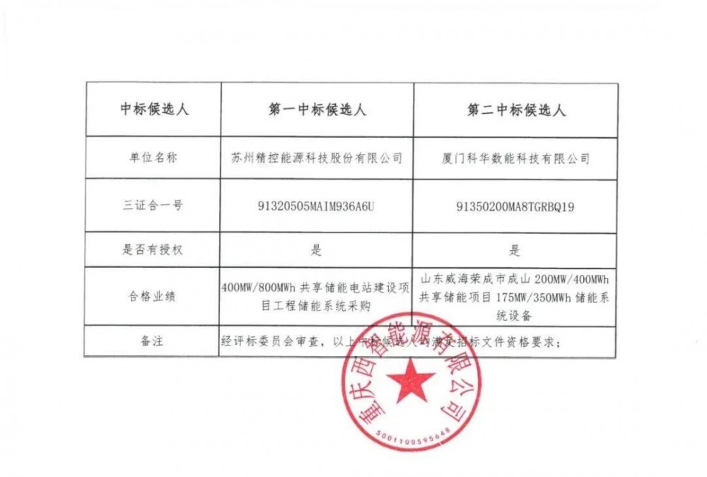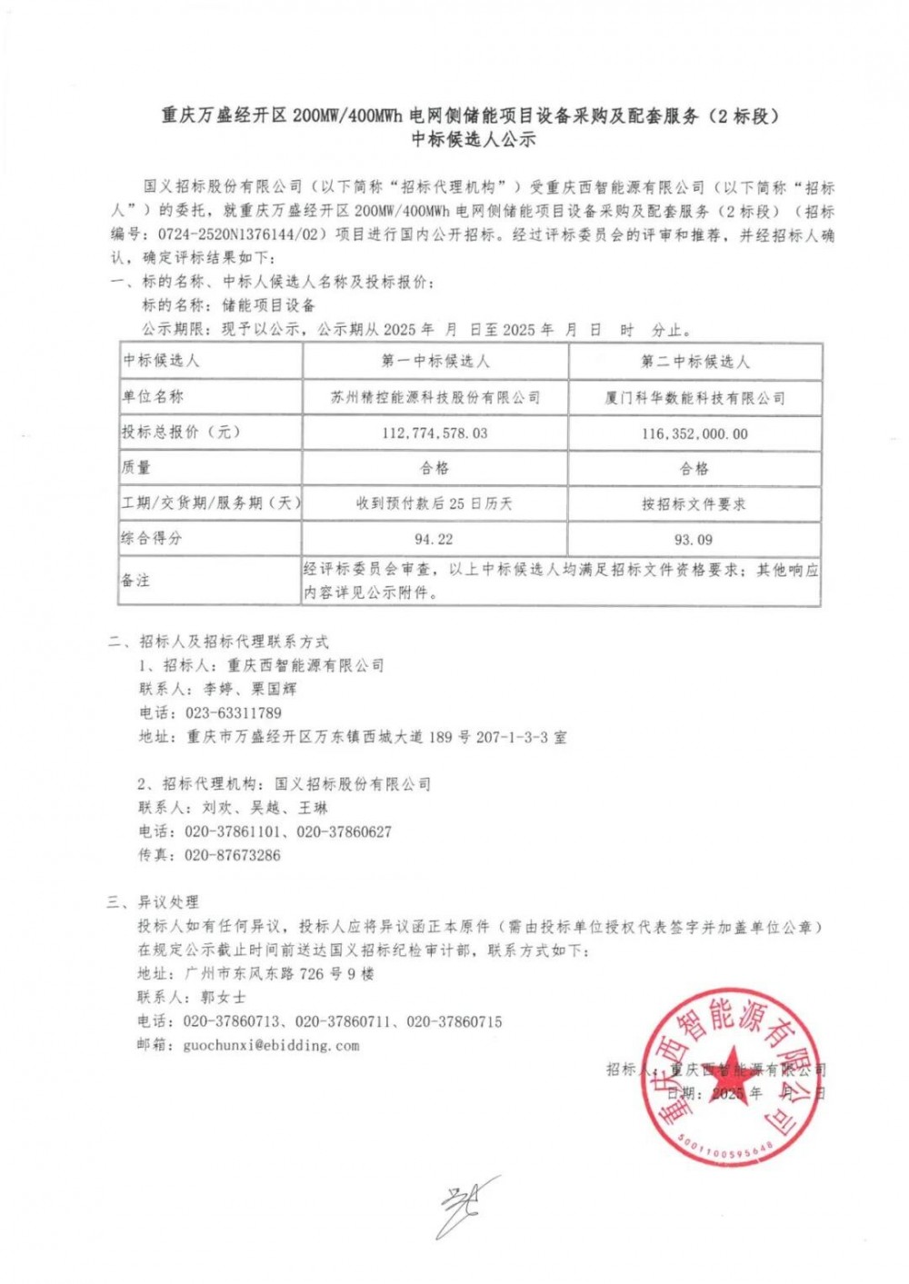 储能界获悉,10月16日,重庆万盛经开区200MW/400MWh电网侧储能项目设备采购及配套服务(1标段,2标段)中标候选人公示,精控能源和科华数能分别入围两个标段,分别列第1、第2中标候选人,折算单价分别为0.5639元/Wh、0.5818元/Wh。