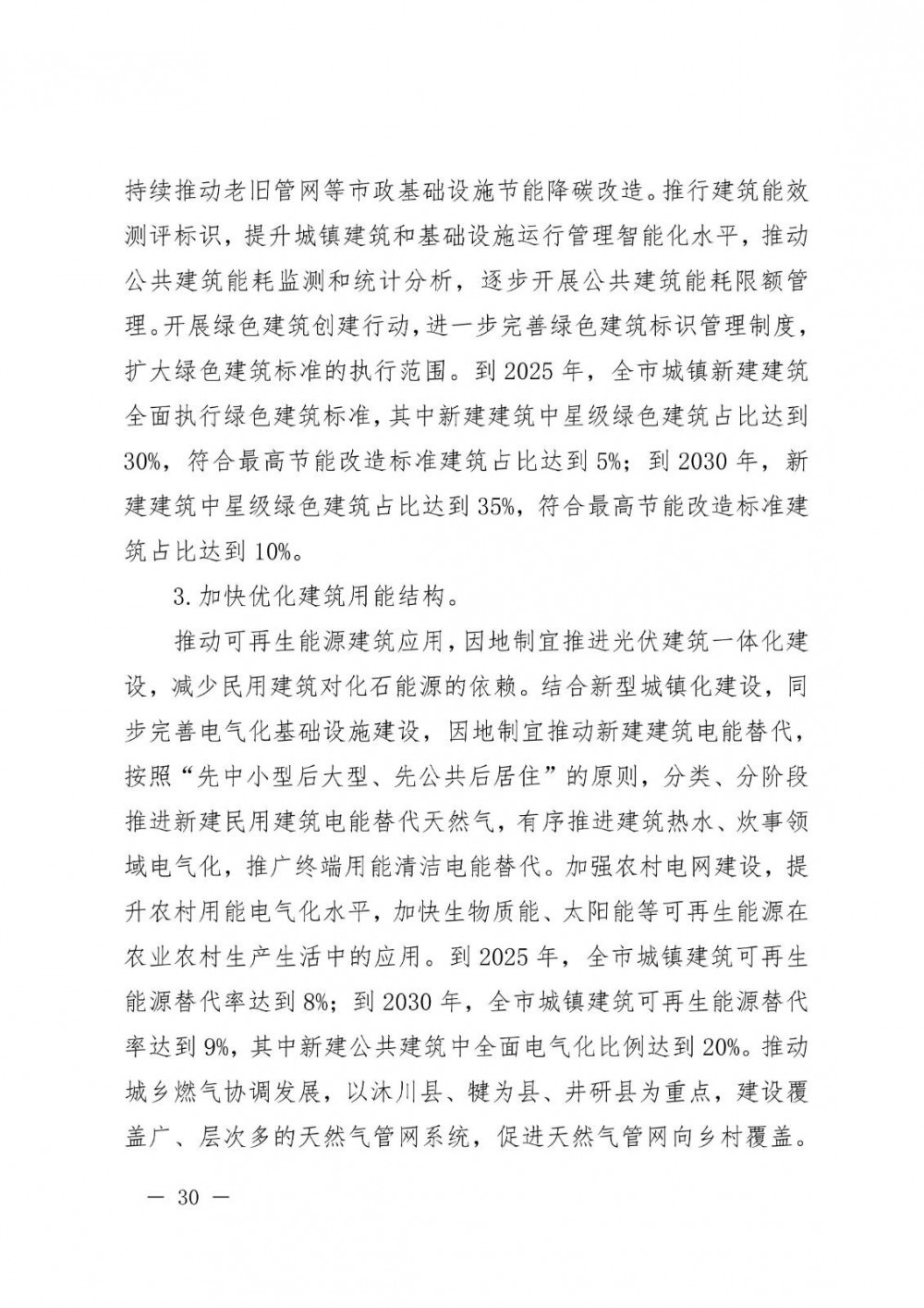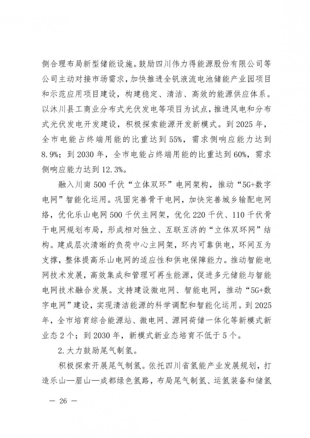 构建新型电力系统,以水电为基,融合多能互补。秉持平衡资源开发与生态保护原则,科学有序推进岷江、大渡河水电梯级开发,加快岷江航电枢纽及枕头坝二级、沙坪一级等水电项目建设,规范现有小水电运行,整改或退出不符合生态保护要求的小水电工程。到2025年,全市可再生能源发电总装机容量达到745.52万千瓦,其中水电装机容量达到693万千瓦;到2030年,力争全市可再生能源发电总装机容量达到800万千瓦。创新发展新能源,支持市中区试点探索“分布式能源”模式,积极开展“新能源+储能”、源网荷储一体化建设,依据电源点、用户侧和电网侧合理布局新型储能设施。鼓励四川伟力得能源股份有限公司等公司主动对接市场需求,加快推进全钒液流电池储能产业园项目和示范应用项目建设,构建稳定、清洁、高效的能源供应体系。以沐川县工商业分布式光伏发电等项目为试点,推进风电和分布式光伏发电开发建设,积极探索能源开发新模式。到2025年,全市电能占终端用能的比重达到55%,需求侧响应能力达到8.9%;到2030年,全市电能占终端用能的比重达到60%,需求侧响应能力达到12.3%。