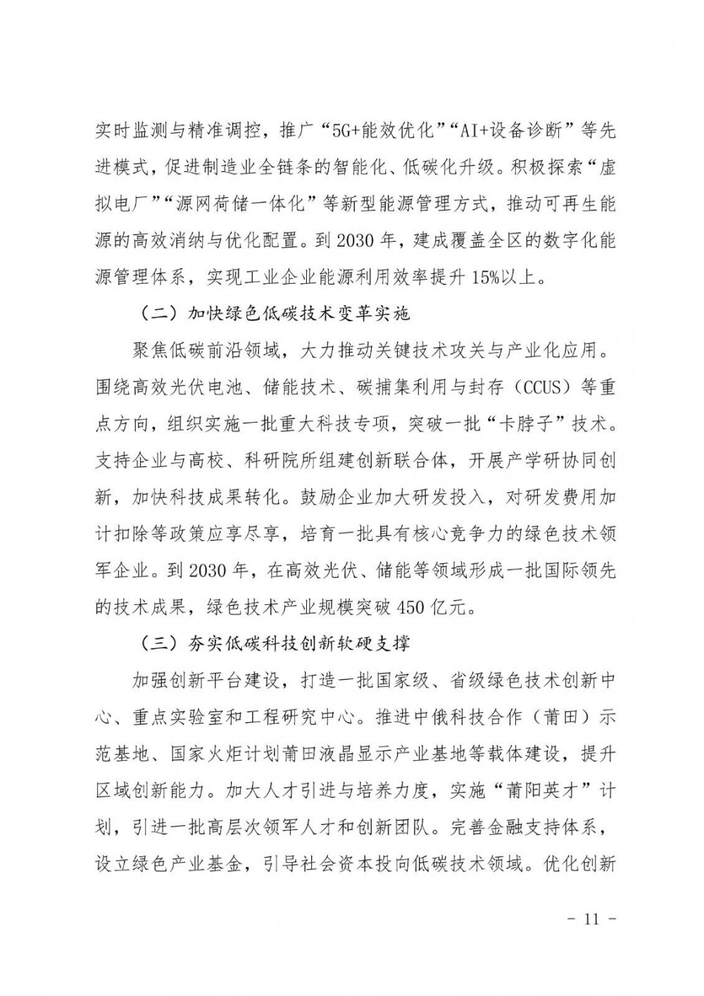 聚焦低碳前沿领域,大力推动关键技术攻关与产业化应用。围绕高效光伏电池、储能技术、碳捕集利用与封存(CCUS)等重点方向,组织实施一批重大科技专项,突破一批“卡脖子”技术。支持企业与高校、科研院所组建创新联合体,开展产学研协同创新,加快科技成果转化。鼓励企业加大研发投入,对研发费用加计扣除等政策应享尽享,培育一批具有核心竞争力的绿色技术领军企业。到2030年,在高效光伏、储能等领域形成一批国际领先的技术成果,绿色技术产业规模突破450亿元。