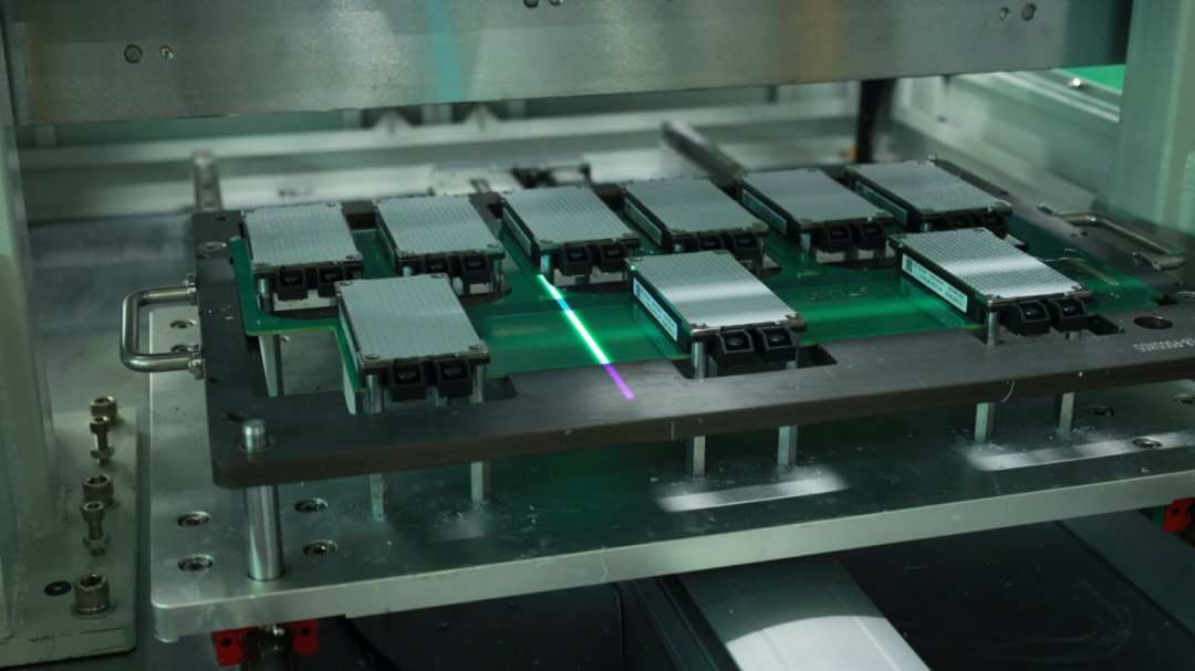 产线革新后,奇点能源首次采用基于3D线激光测量技术的全自动硅脂涂覆与检测一体化设备,通过实时三维扫描,有效管控9个IGBT硅脂涂覆厚度的一致性,从而保障它与液冷板贴合过程中的导热稳定性。