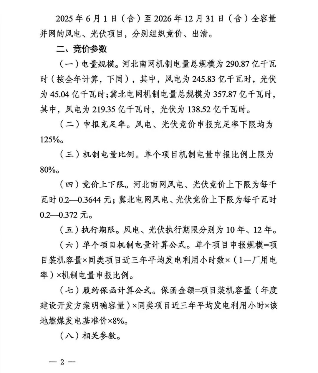 (四)竞价上下限。河北南网风电、光伏竞价上下限为每千瓦时0.2-0.3644元;冀北电网风电、光伏竞价上下限为每千瓦时0.2--0.372 元。
