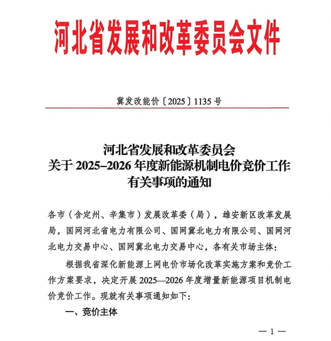 储能界获悉,10月17日,河北省发改委发布《关于2025-2026年度新能源机制电价竞价工作有关事项的通知》。文件指明: