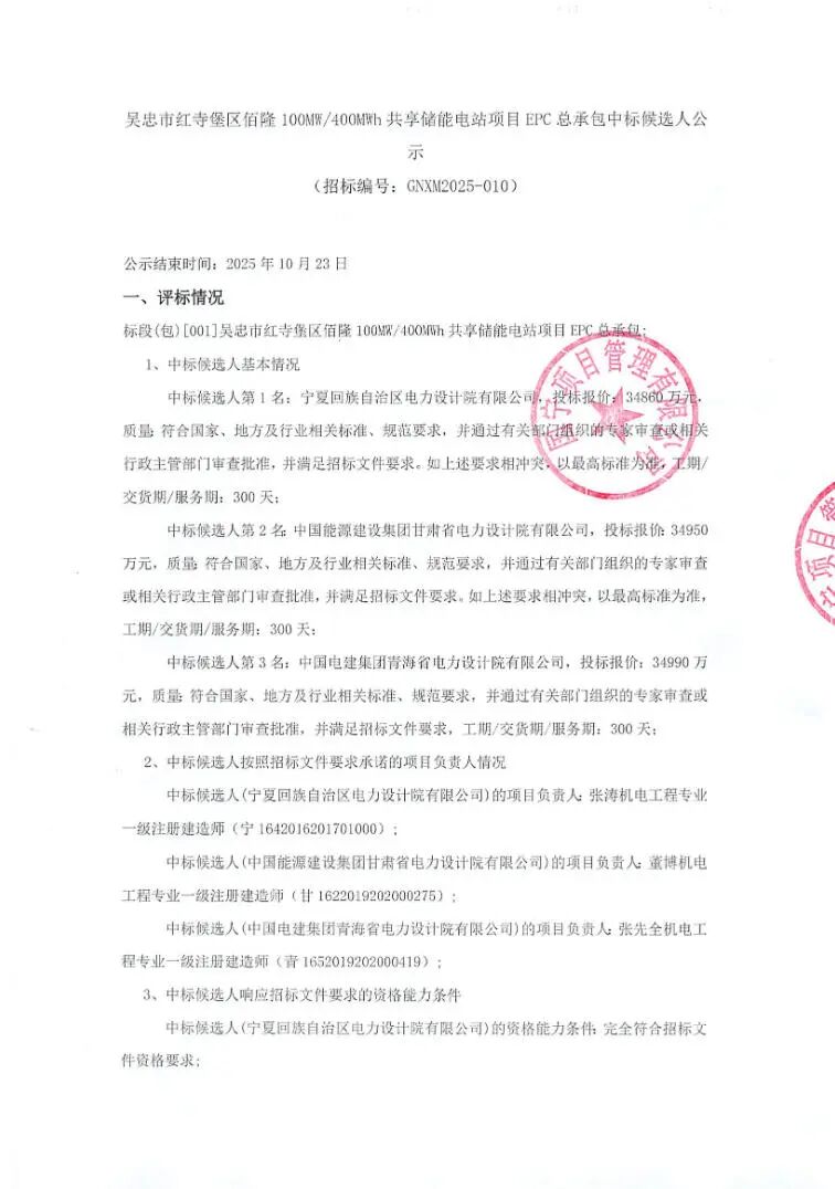 储能界获悉,10月20日,吴忠市红寺堡区佰隆100MW/400MWh共享储能电站项目EPC总承包中标候选人公示。