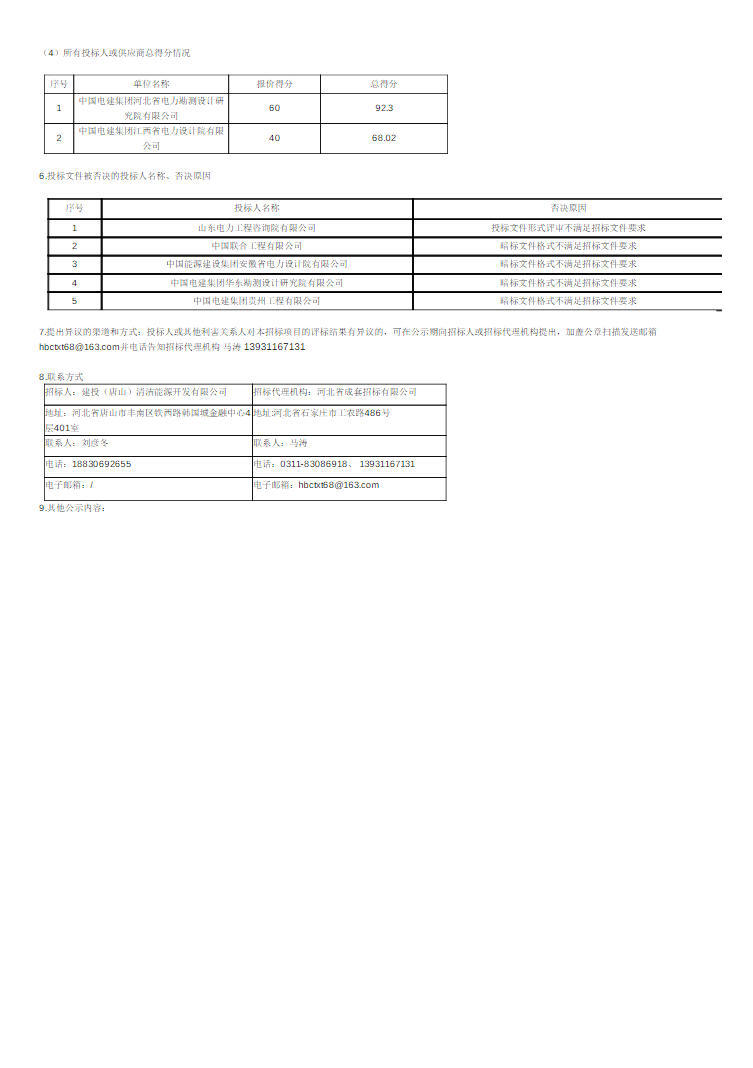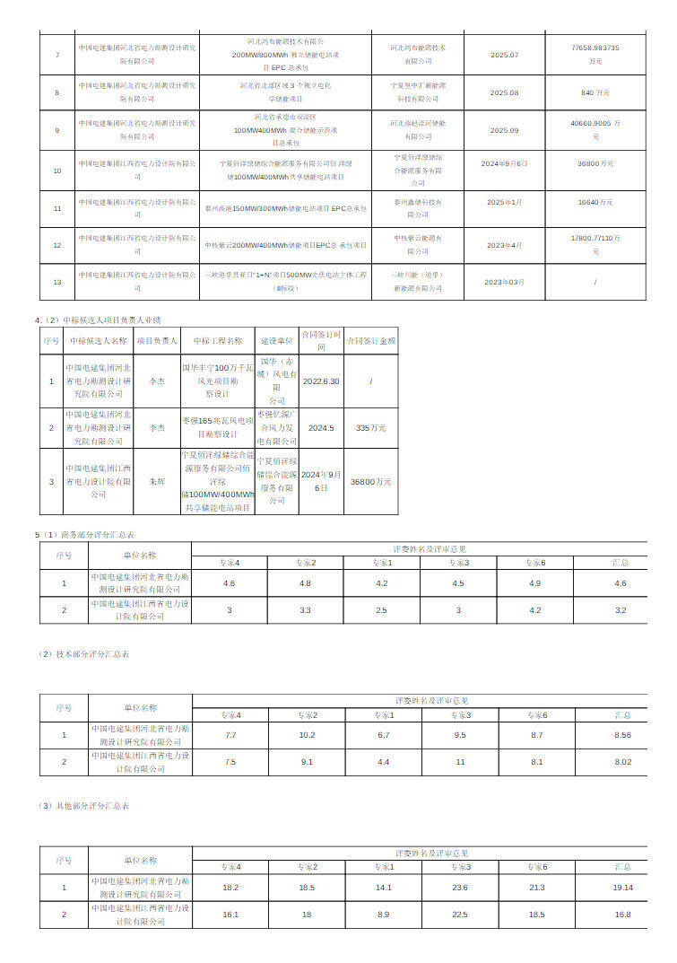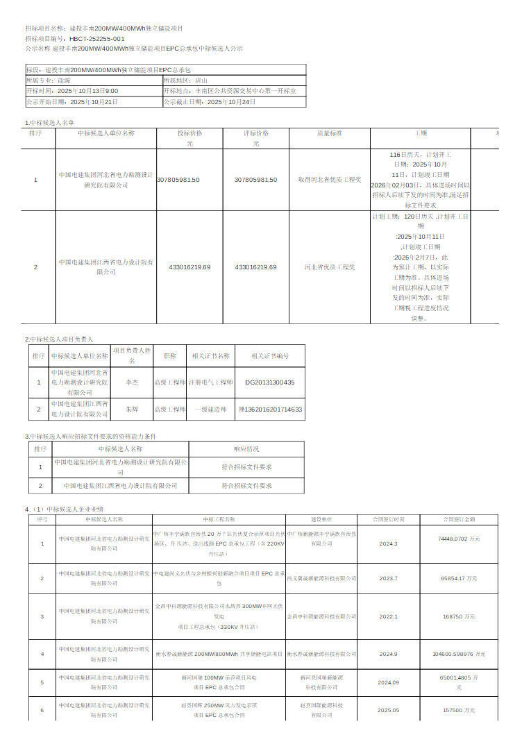 第一中标候选人为中国电建集团河北省电力勘测设计研究院有限公司,投标报价307805981.5元,折合单价0.7695元/Wh;第二中标候选人为中国电建集团江西省电力设计院有限公司,投标报价433016219.69元,折合单价1.0825元/Wh。