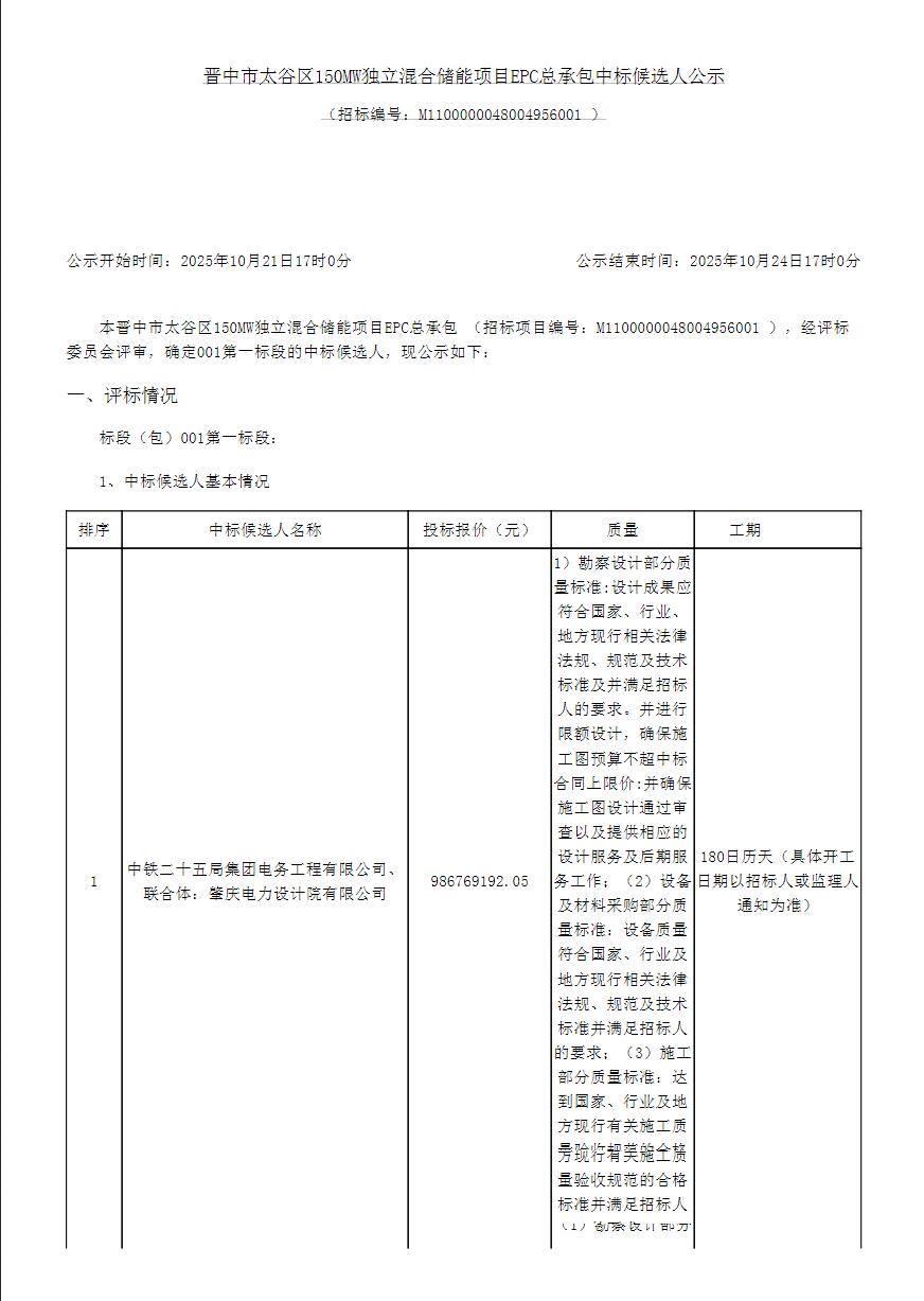 10月21日,晋中市太谷区150MW独立混合储能项目EPC总承包中标候选人公示。