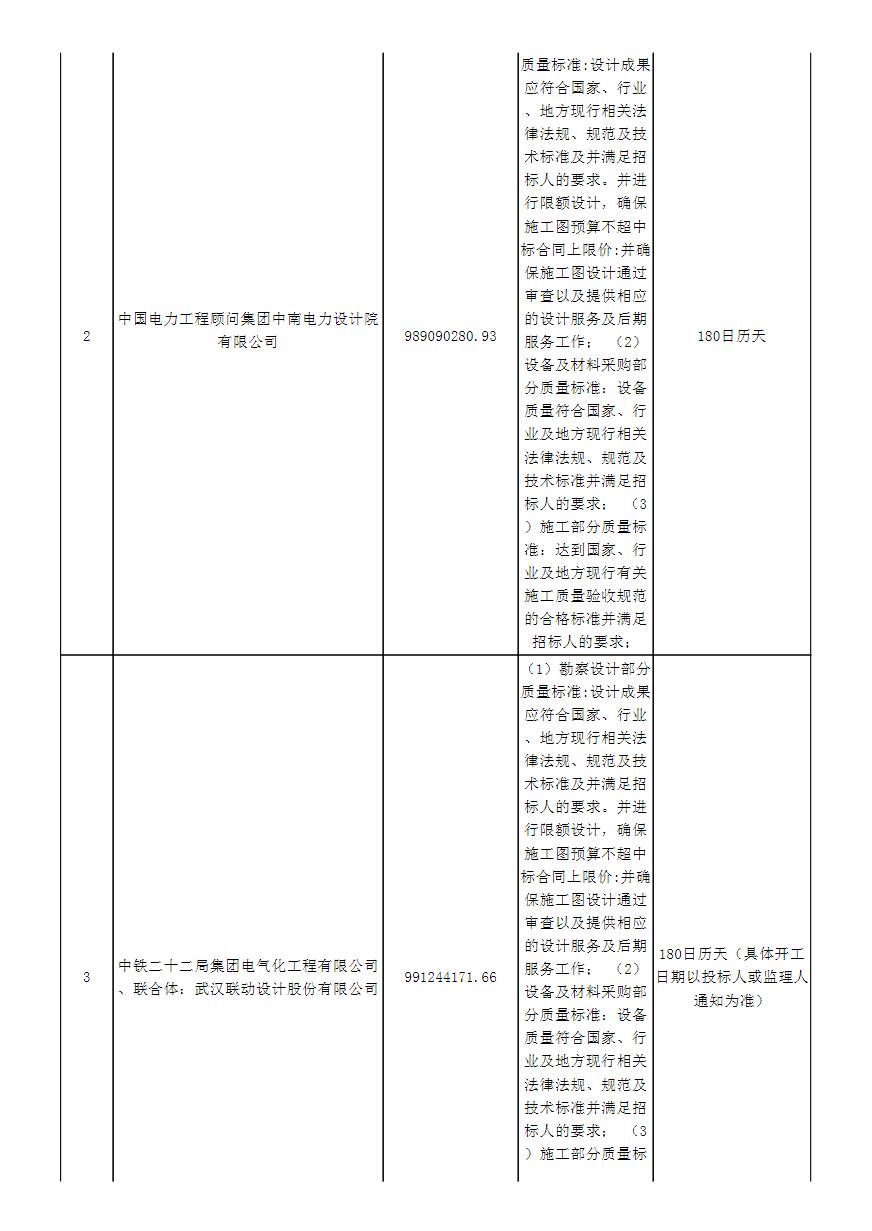 第一中标候选人为中铁二十五局集团电务工程有限公司、联合体:肇庆电力设计院有限公司,投标报价986769192.051元;第二中标候选人为中国电力工程顾问集团中南电力设计院有限公司,投标报价989090280.93元;第三中标候选人为中铁二十二局集团电气化工程有限公司、联合体:武汉联动设计股份有限公司,投标报价991244171.66元。