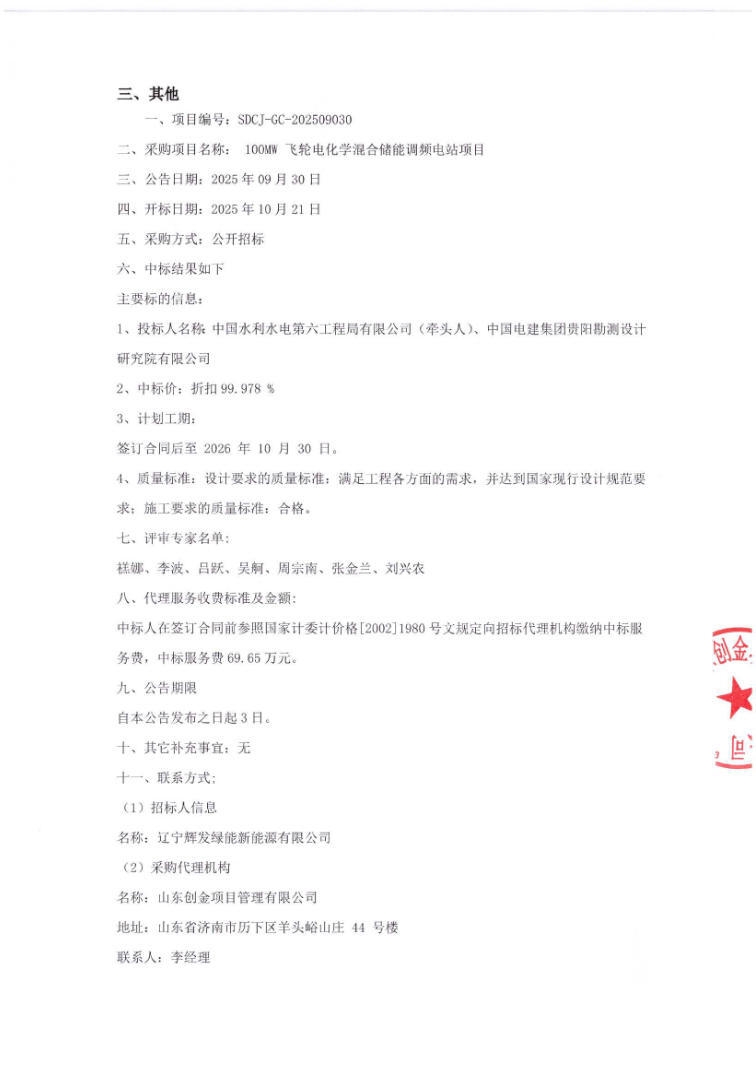 10月21日,100MW飞轮电化学混合储能调频电站项目中标候选人公示。第一中标候选人为中国水利水电第六工程局有限公司、中国电建集团贵阳勘测设计研究院有限公司联合体。