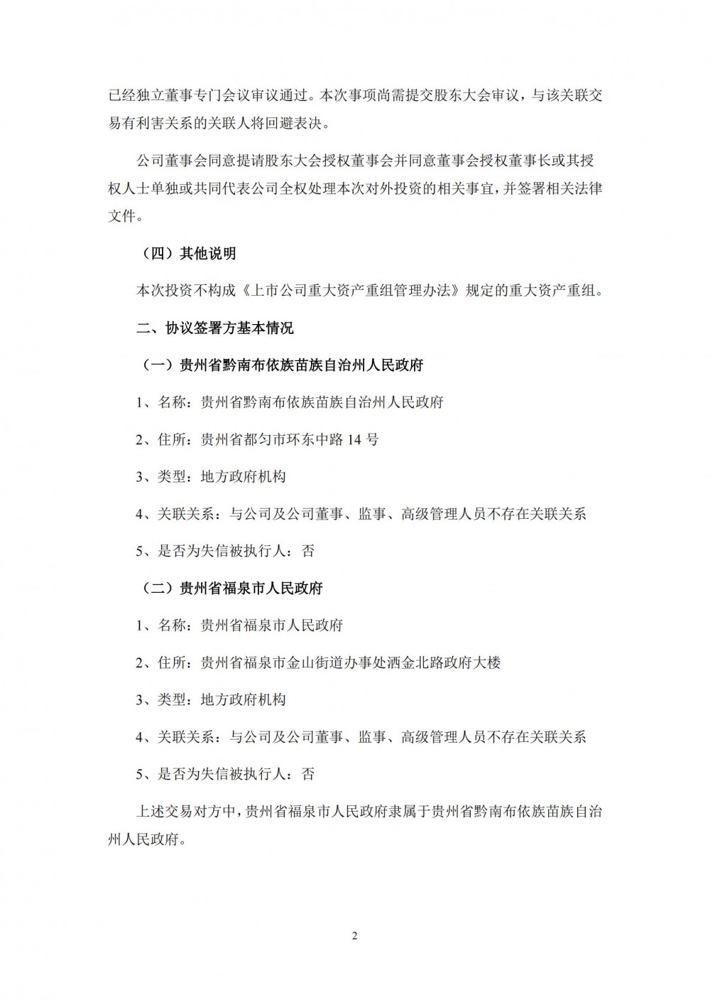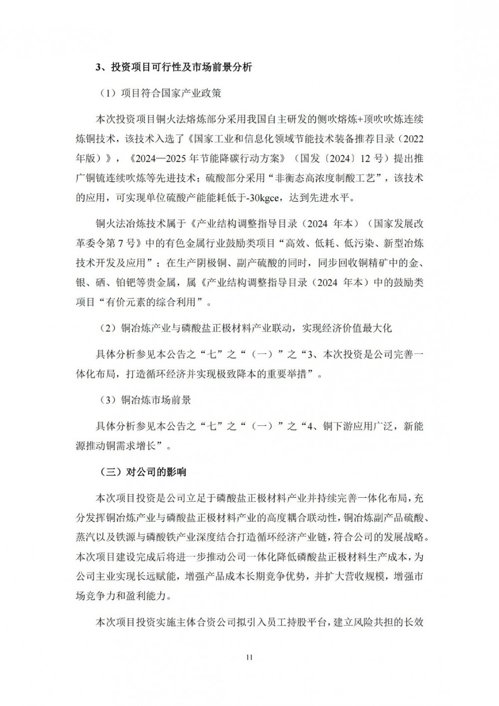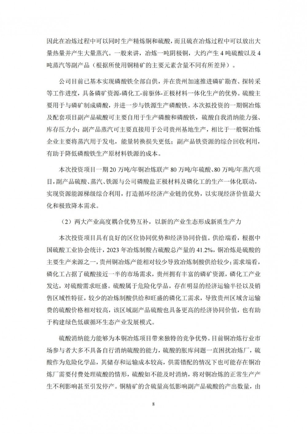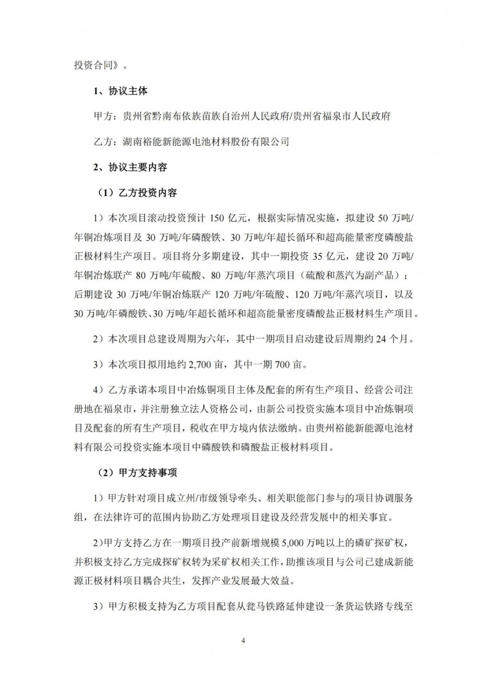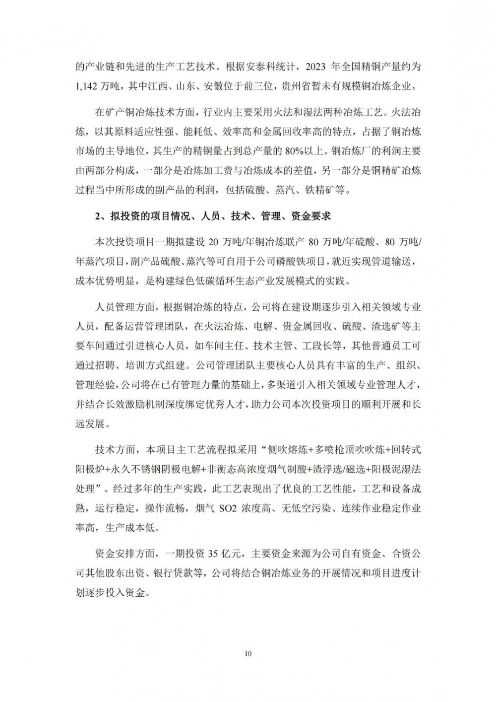 针对本次投资事项,公司拟与贵州省黔南布依族苗族自治州人民政府签署《战略合作协议》,并就项目具体事宜拟与贵州省福泉市人民政府签署《项目投资合同》。项目将分多期建设,其中一期投资35亿元,建设20万吨/年铜冶炼联产80万吨/年硫酸、80万吨/年蒸汽项目(硫酸和蒸汽为副产品)。