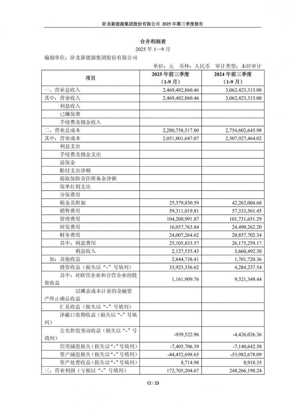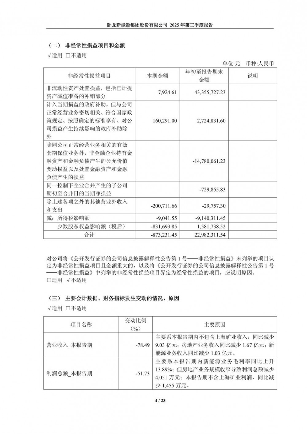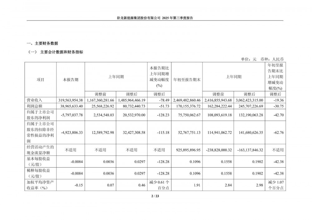 10月23日,卧龙新能发布2025年第三季度报告。公司第三季度营业收入3.2亿元,同比下降78.49%;净利润-579.7万元,同比由盈转亏。前三季度营业收入24.69亿元,同比下降19.36%;净利润7575.01万元,同比下降42.7%。
