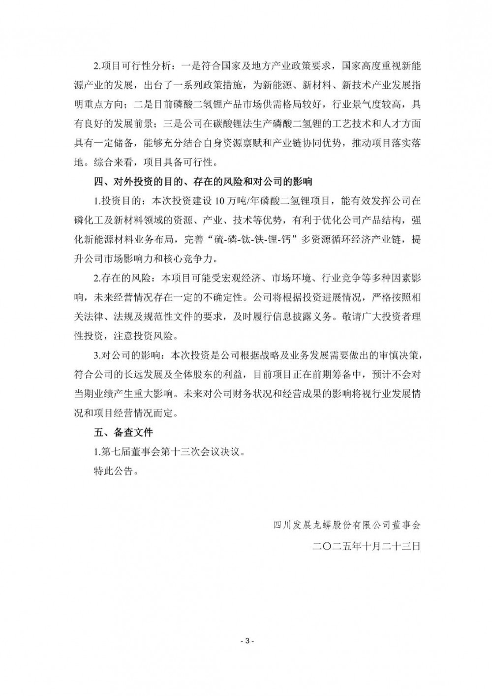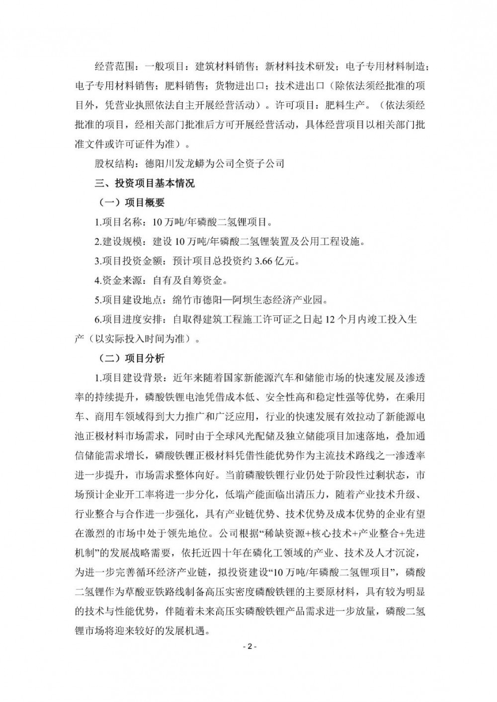 本次投资建设10万吨/年磷酸二氢锂项目,能有效发挥川发龙蟒在磷化工及新材料领域的资源、产业、技术等优势,有利于优化公司产品结构,强化新能源材料业务布局,完善“硫-磷-钛-铁-锂-钙”多资源循环经济产业链,提升公司市场影响力和核心竞争力。