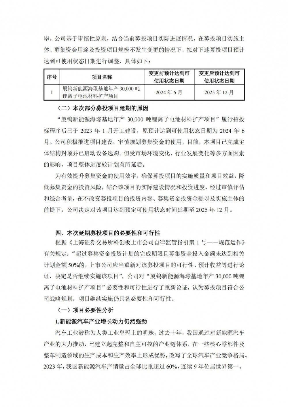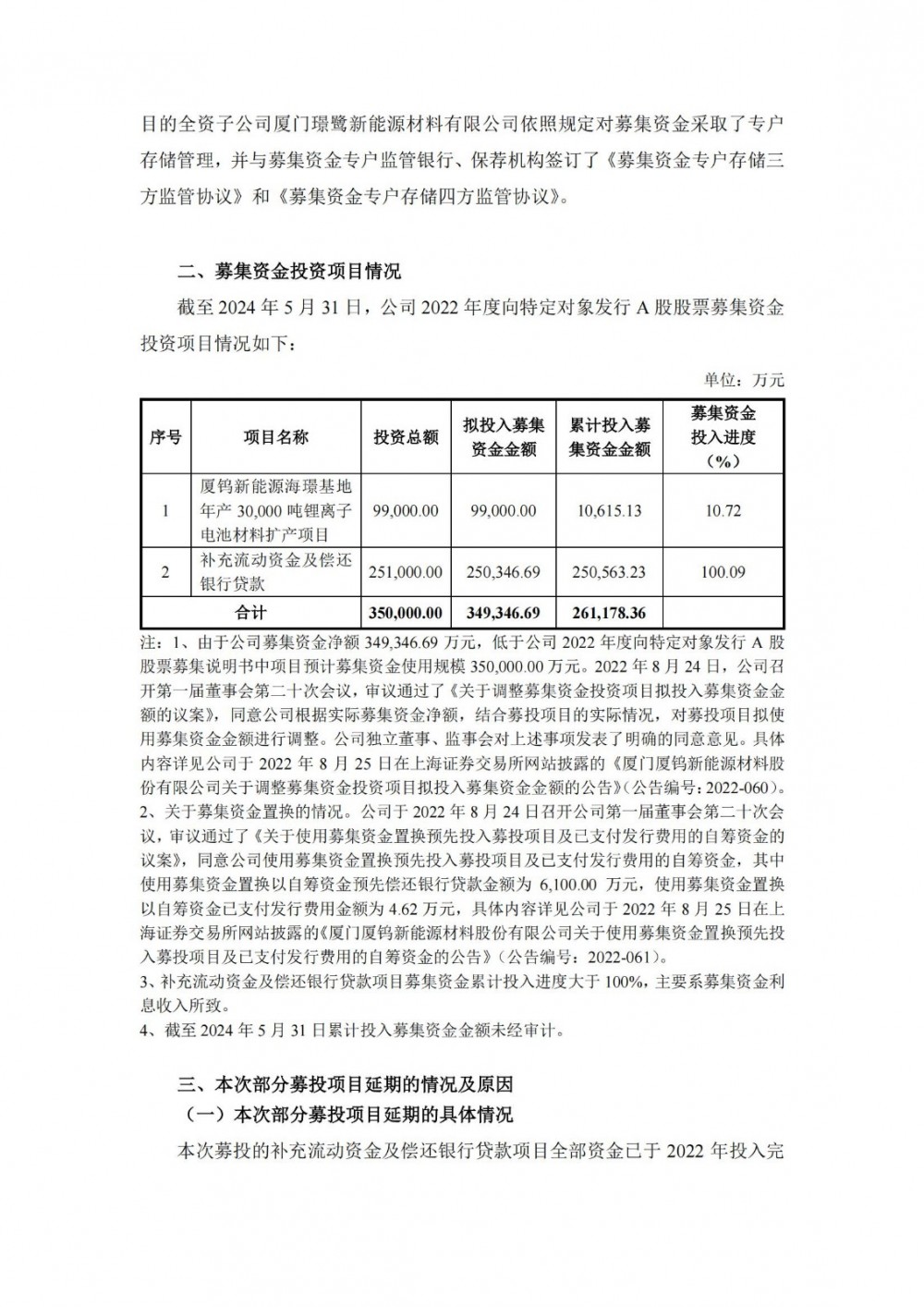 厦钨新能表示,“厦钨新能源海璟基地年产30,000吨锂离子电池材料扩产项目”履行招投标程序后已于2023年1月开工建设,原预计达到可使用状态日期为2024年6月。公司积极推进项目建设,审慎规划募集资金的使用,目前,本项目已完成主体结构封顶并已启动设备选购。但受市场环境变化、行业发展变化等多方面因素的影响,项目整体进度较计划有所延后。