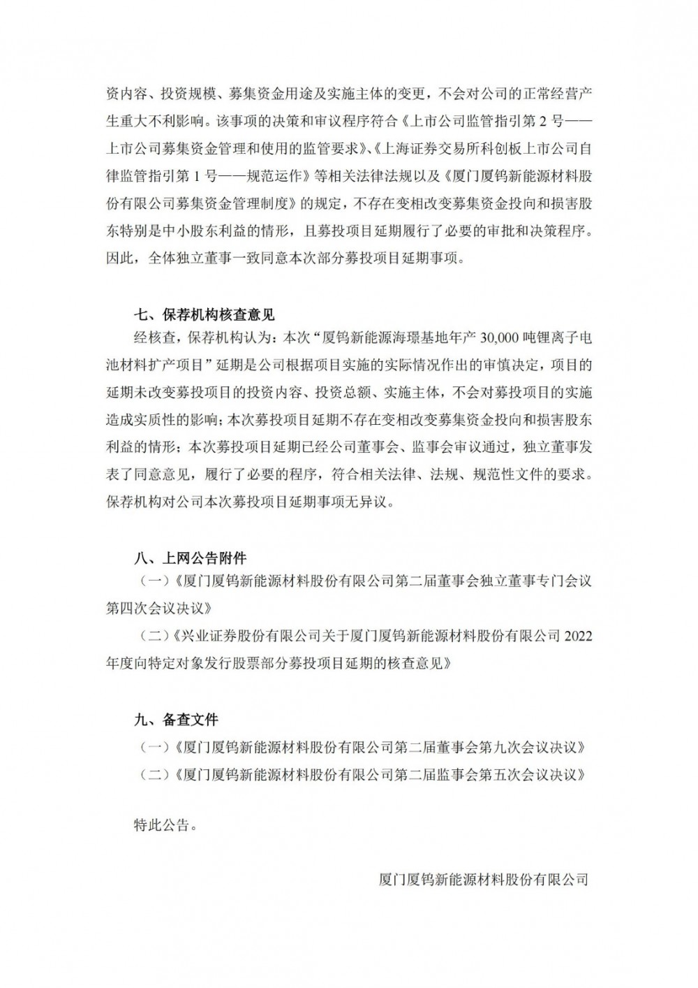 据储能界了解到,6月28日,厦钨新能发布公告称,公司决定在不改变募投项目的投资内容、募集资金投资金额以及实施主体的前提下,对2022年度向特定对象发行股票募集资金投资项目之一的“厦钨新能源海璟基地年产30,000吨锂离子电池材料扩产项目”达到预定可使用状态的时间进行调整。项目可使用状态日期由2024年6月变更为2025年12月。