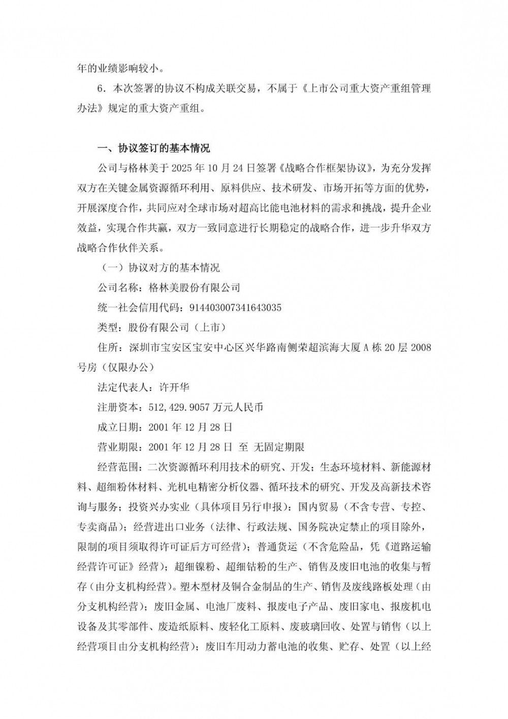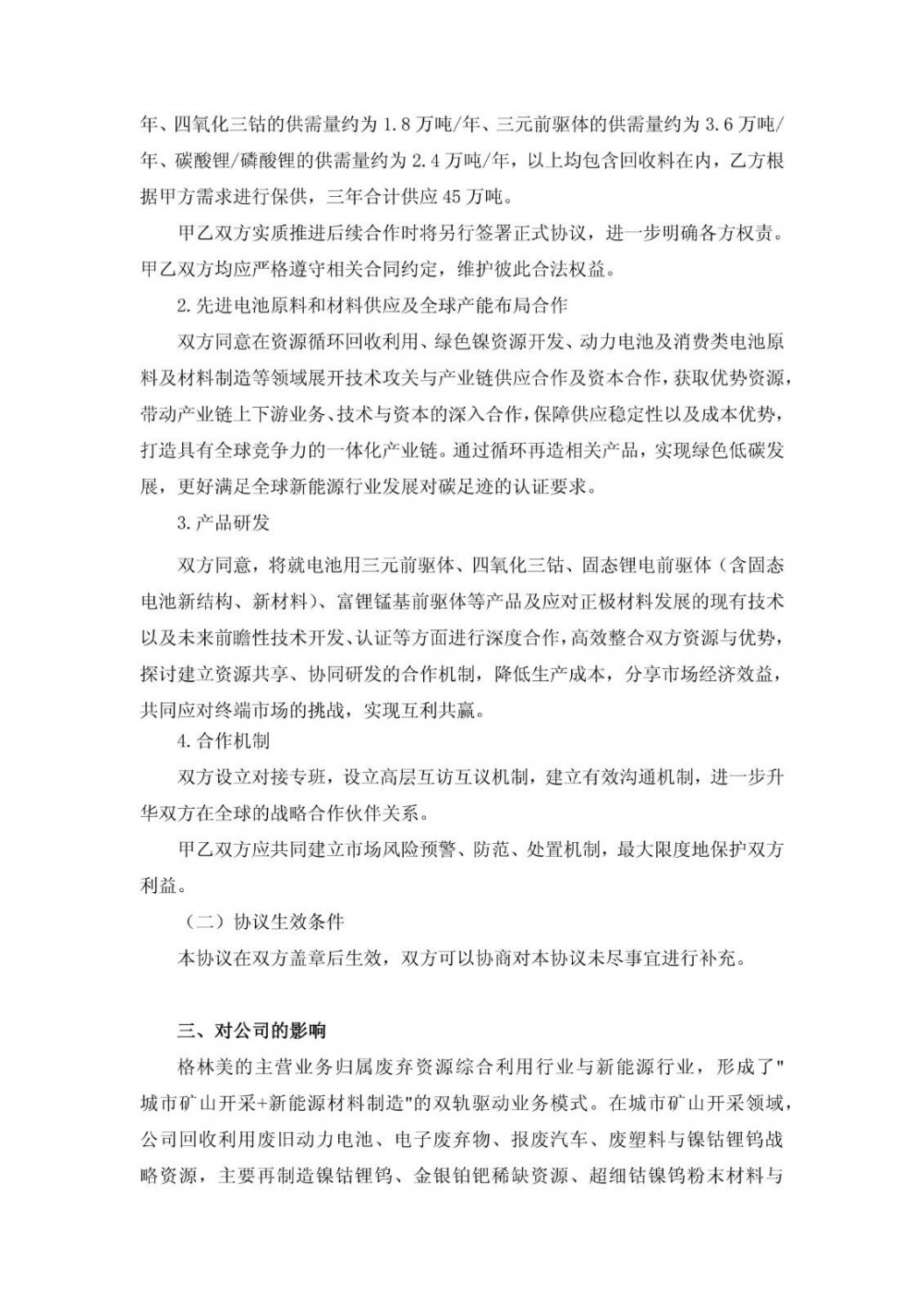 根据协议,2026年-2028年,格林美预计每年向公司供应各类电池原料与材料产品15万吨,其中包括氯化钴的供需量约为3.6万吨/年、硫酸镍的供需量约为3.6万吨/年、四氧化三钴的供需量约为1.8万吨/年、三元前驱体的供需量约为3.6万吨/年、碳酸锂/磷酸锂的供需量约为2.4万吨/年,以上均包含回收料在内,格林美根据公司需求进行保供,三年合计供应45万吨。