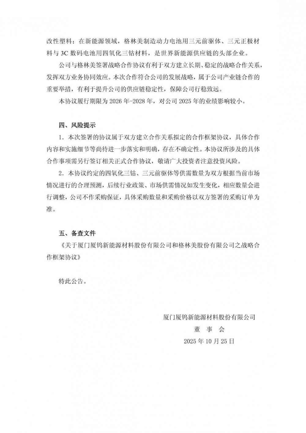 厦钨新能表示,公司与格林美签署战略合作协议有利于双方建立长期、稳定的战略合作关系,发挥双方业务协同效应。本次合作符合公司的发展战略,属于公司产业链合作的重要举措,有利于提升公司的供应链稳定性,保障公司行稳致远。