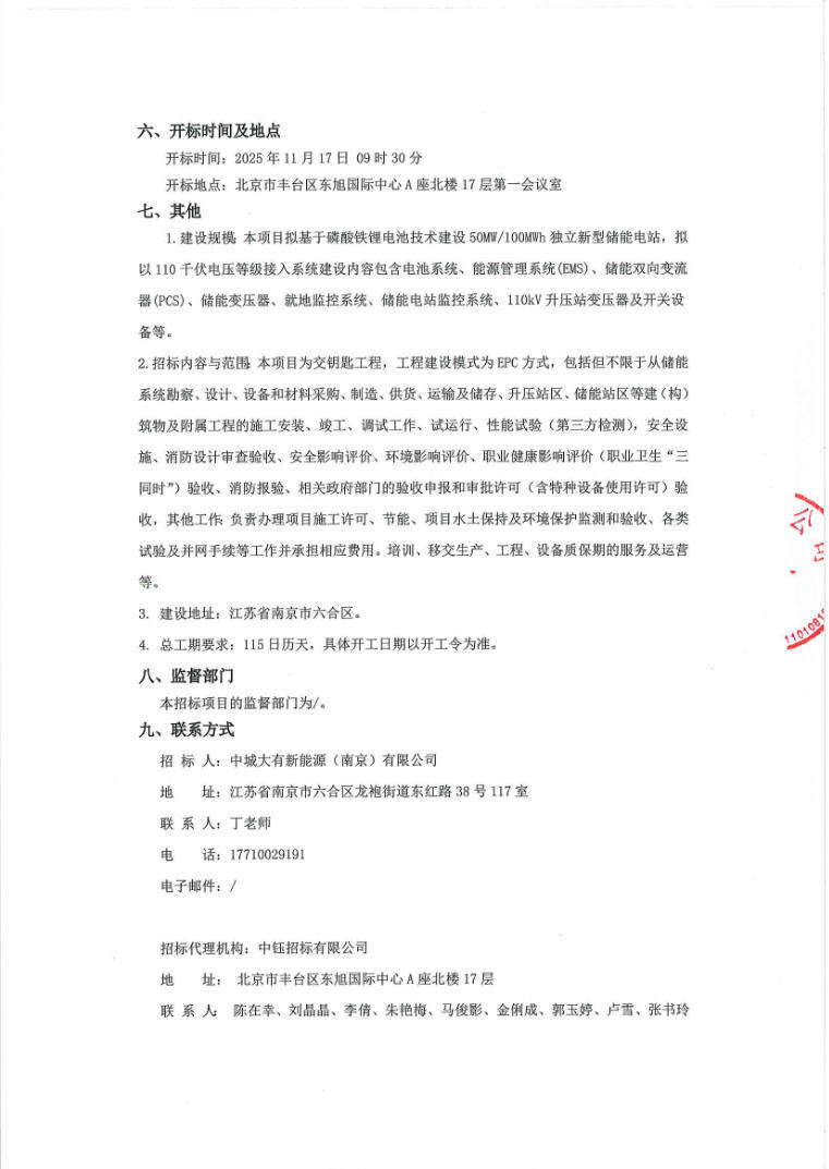 10月24日,中城大有六合龙袍50MW/100MWh储能电站项目-EPC总承包招标公告发布。