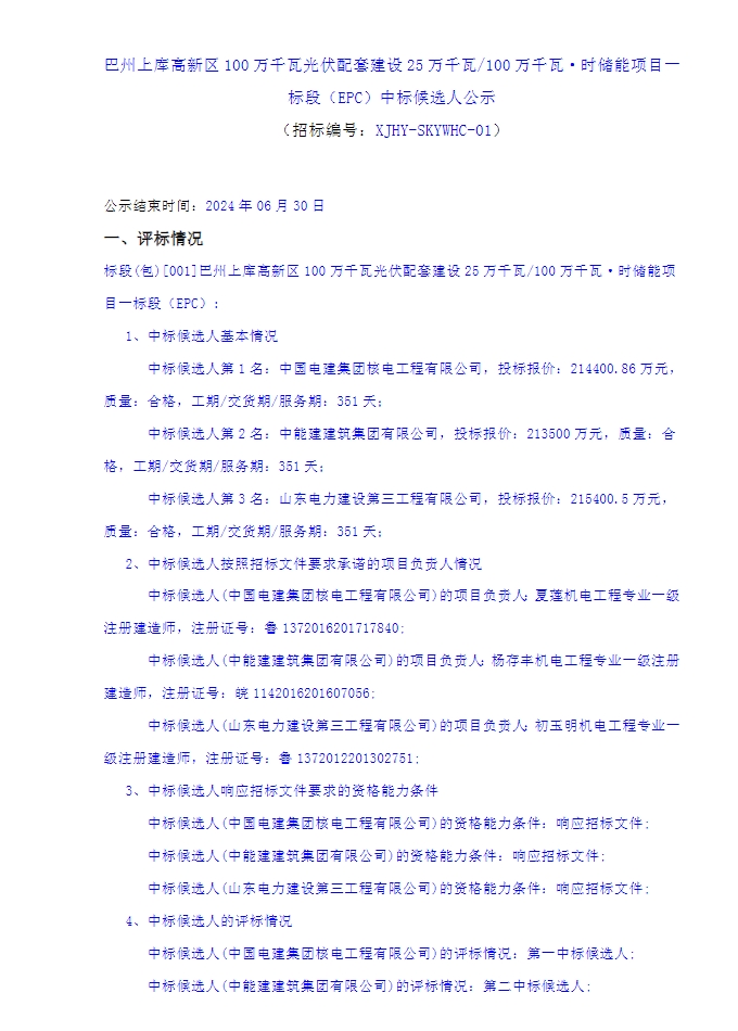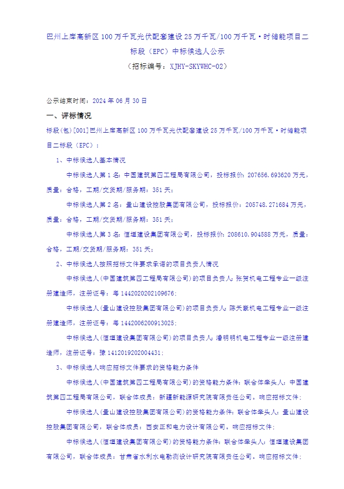 据储能界了解到,6月27日,巴州上库高新区100万千瓦光伏配套建设25万千瓦/100万千瓦·时储能项目EPC中标候选人公示。