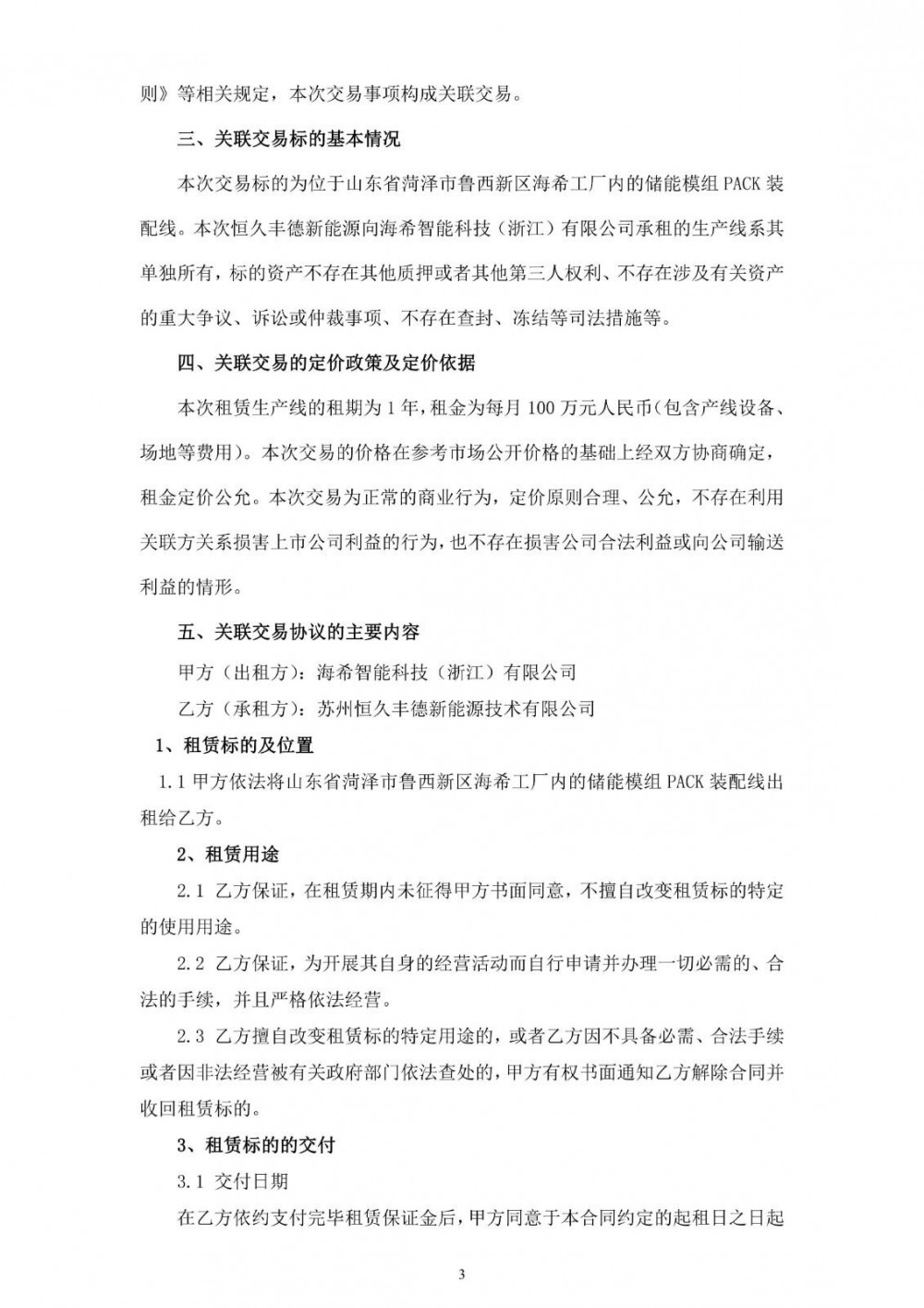 10月28日,*ST恒久发布公告称,公司全资子公司苏州恒久丰德新能源技术有限公司于近日与海希智能科技(浙江)有限公司签订《生产线租赁合同》。甲方依法将山东省菏泽市鲁西新区海希工厂内的储能模组PACK装配线出租给乙方,租期:1年,租金:每月100万元人民币。