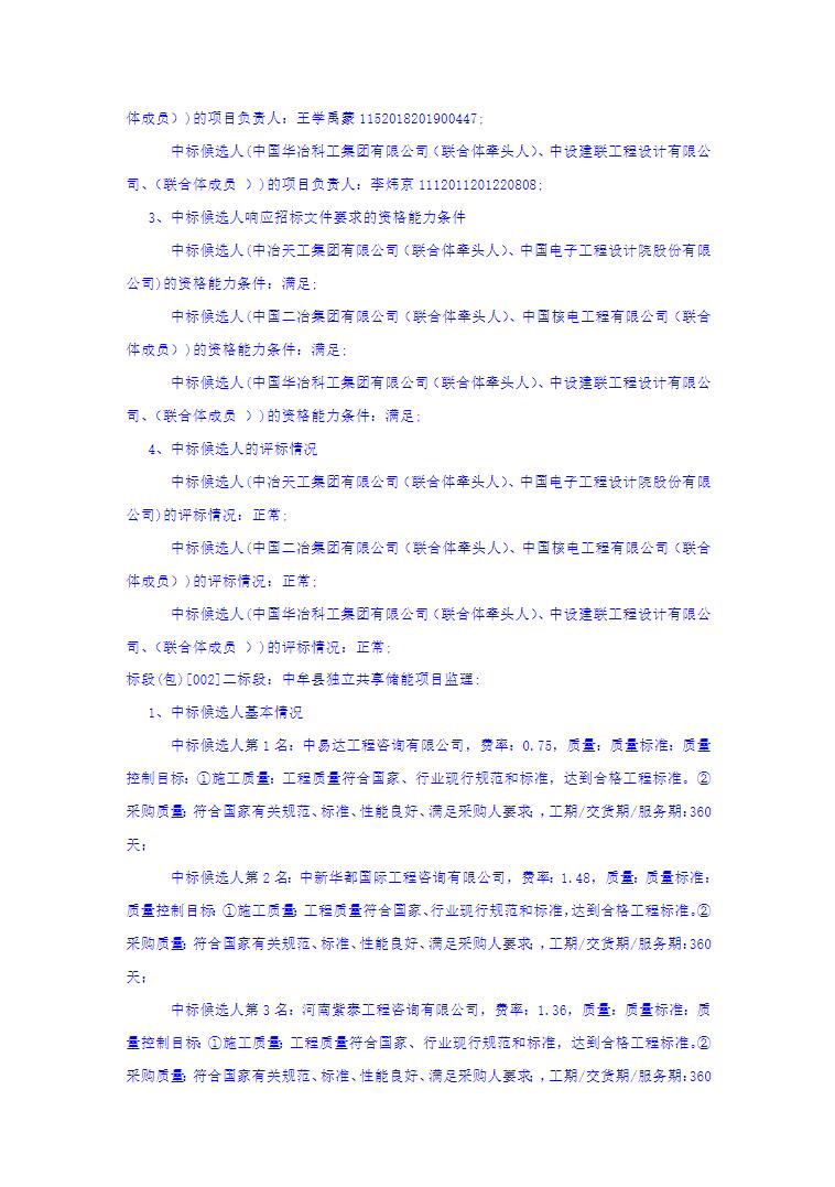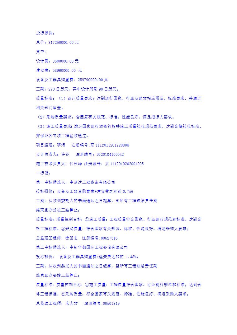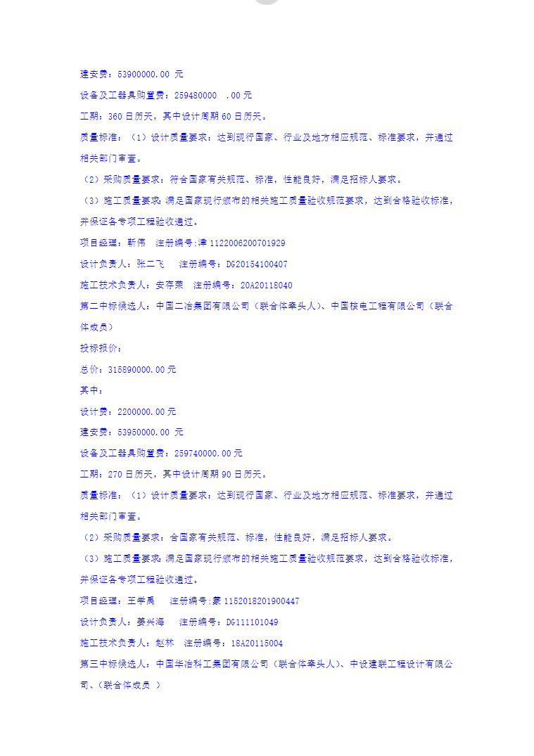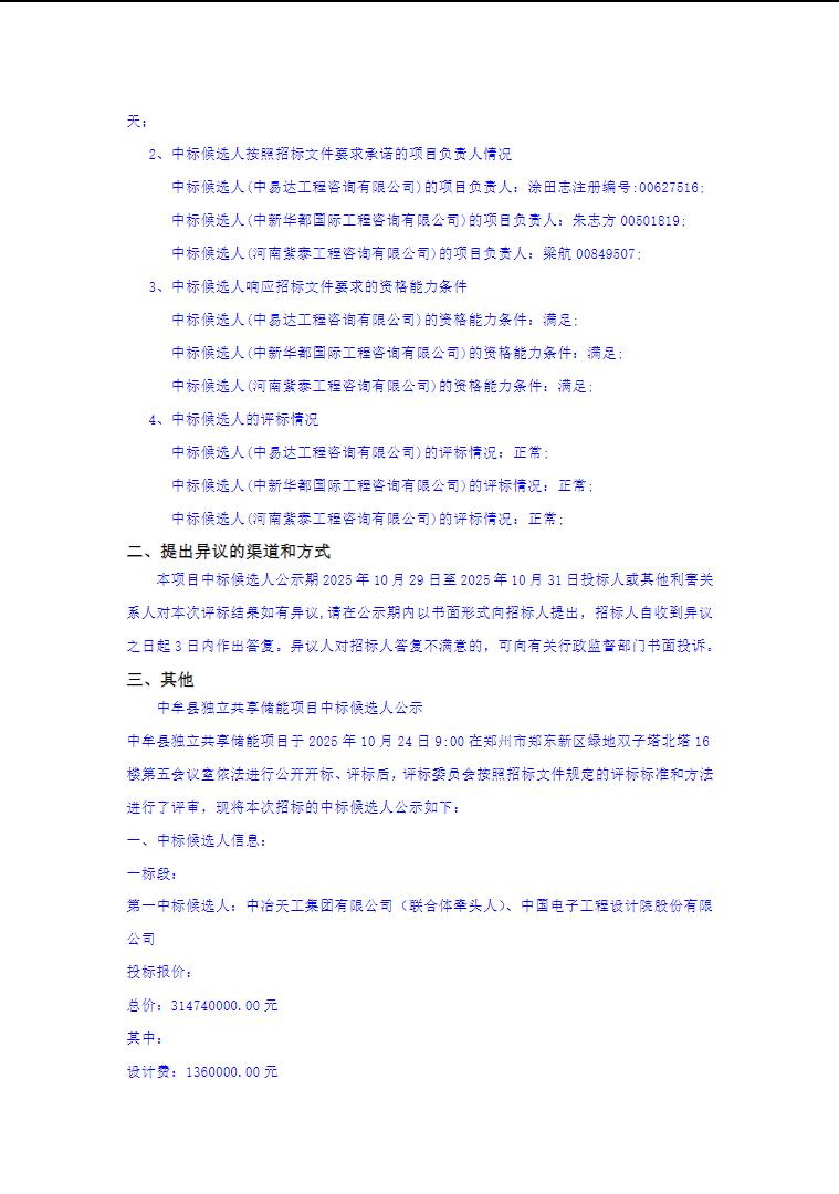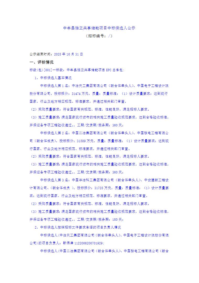 第一中标候选人为中冶天工集团有限公司、中国电子工程设计院股份有限公司联合体,投标报价31474万元,折合单价1.5737元/Wh;第二中标候选人为中国二治集团有限公司、中国核电工程有限公司联合体,投标报价31589.00万元,折合单价1.5795元/Wh;第三中标候选人为中国华冶科工集团有限公司、中设建联工程设计有限公司联合体,投标报价31725万元,折合单价1.5863元/Wh。