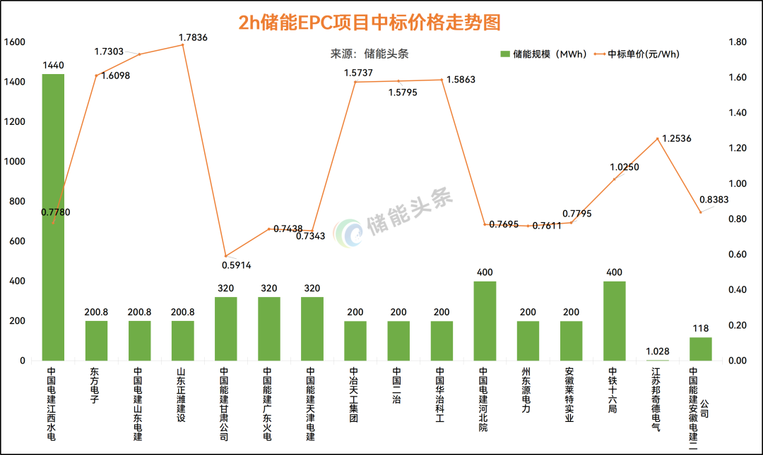最低价由中国能源建设集团(甘肃)工程有限公司在华能广西分公司西乡塘400MW800MWh(二期160MW320MWh)集中式化学储能项目采购-施工PC承包工程中报出, 单价0.5914元/Wh。