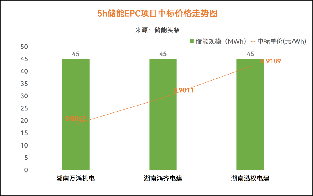 5小时储能EPC,有3个有效报价,报价在0.8862~0.9189元/Wh之间,均价为0.9021元/Wh。