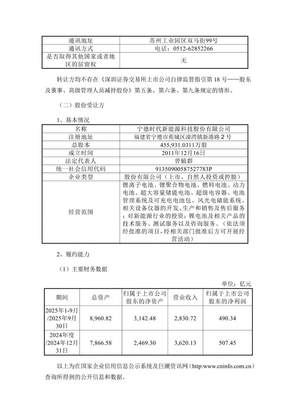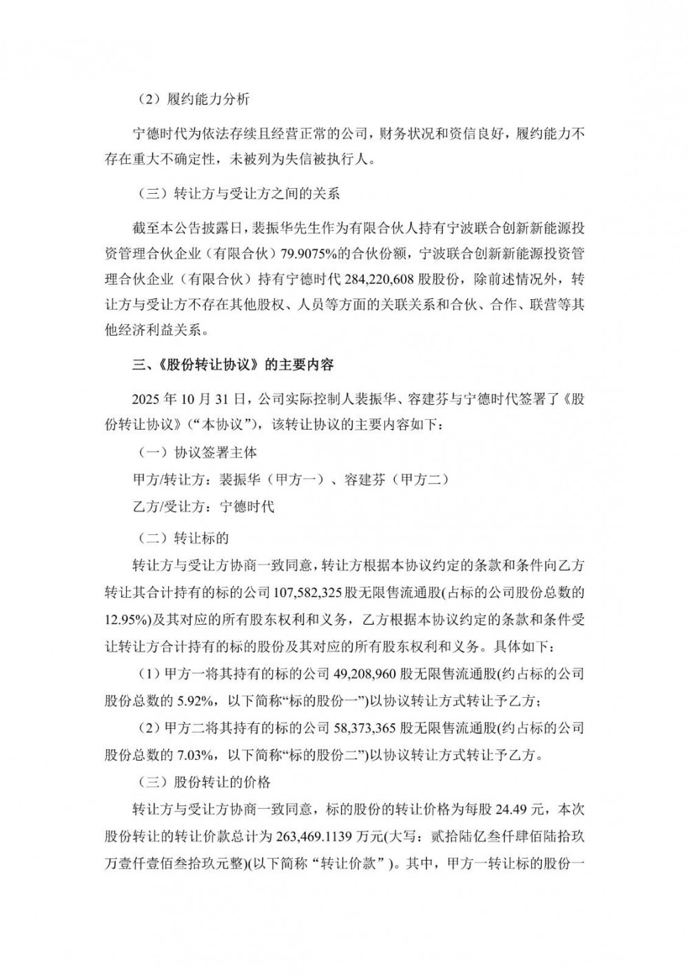 近日,天华新能发布公告称,公司实际控制人裴振华、容建芬夫妇与宁德时代新能源科技股份有限公司(下称“宁德时代”)签署了《关于苏州天华新能源科技股份有限公司之股份转让协议》(下称“《股份转让协议》”)。裴振华、容建芬夫妇拟通过协议转让方式向宁德时代转让其合计持有的公司107,582,325股无限售流通股(占标的公司股份总数的12.95%,具体为:裴振华持有的公司49,208,960股无限售流通股(占标的公司股份总数的5.92%)、容建芬持有的公司58,373,365股无限售流通股(占标的公司股份总数的7.03%)。