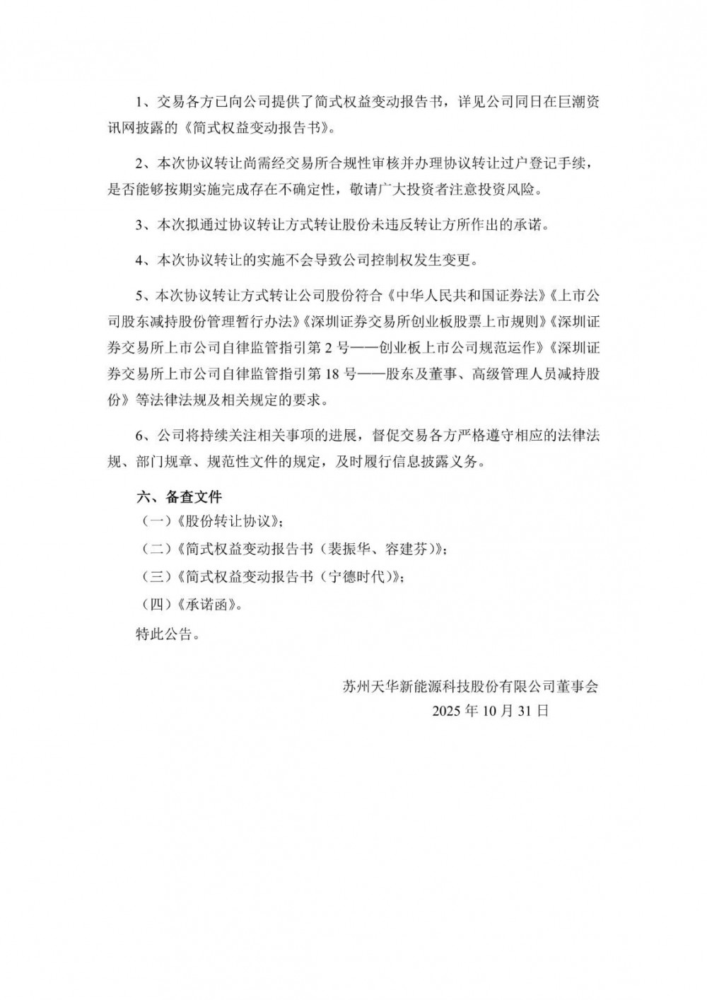 天华新能表示,本次股份转让完成后,宁德时代将持有公司112,498,188股股份(占公司股份总数的13.54%)。以协议转让方式引入战略投资人,将进一步优化公司股东结构,本次股份转让完成后不会导致公司实际控制人、控股股东发生变更,亦不会对公司治理结构及持续经营产生不利影响,也不存在损害上市公司及其他股东利益的情形。